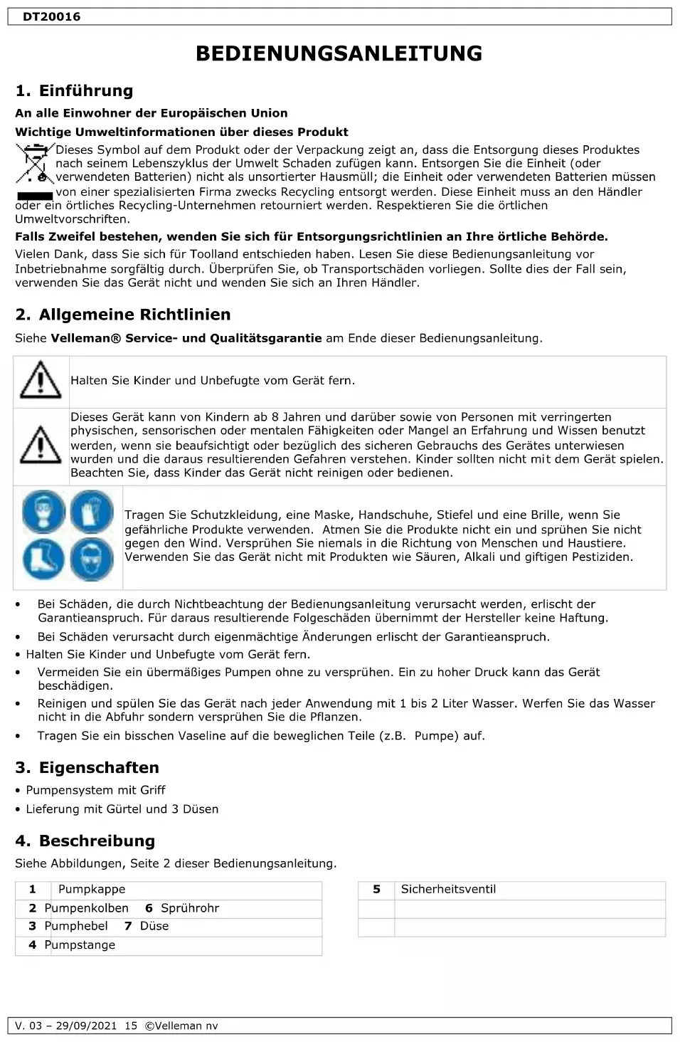 Behälter-Inhalt .......................................................................................................... 16 l Verwenden Sie dieses Gerät nur mit originellen Zubehörteilen. Velleman NV übernimmt keine Haftung für Schaden oder Verletzungen bei (falscher) Anwendung dieses Gerätes. Für mehr Informationen zu diesem Produkt und die neueste Version dieser Bedienungsanleitung, siehe www.toolland.eu. Alle Änderungen ohne vorherige Ankündigung vorbehalten. © URHEBERRECHT Velleman NV besitzt das Urheberrecht für diese Bedienungsanleitung. Alle weltweiten Rechte vorbehalten. Ohne vorherige schriftliche Genehmigung des Urhebers ist es nicht gestattet, diese Bedienungsanleitung ganz oder in Teilen zu reproduzieren, zu kopieren, zu übersetzen, zu bearbeiten oder zu speichern.DT20016