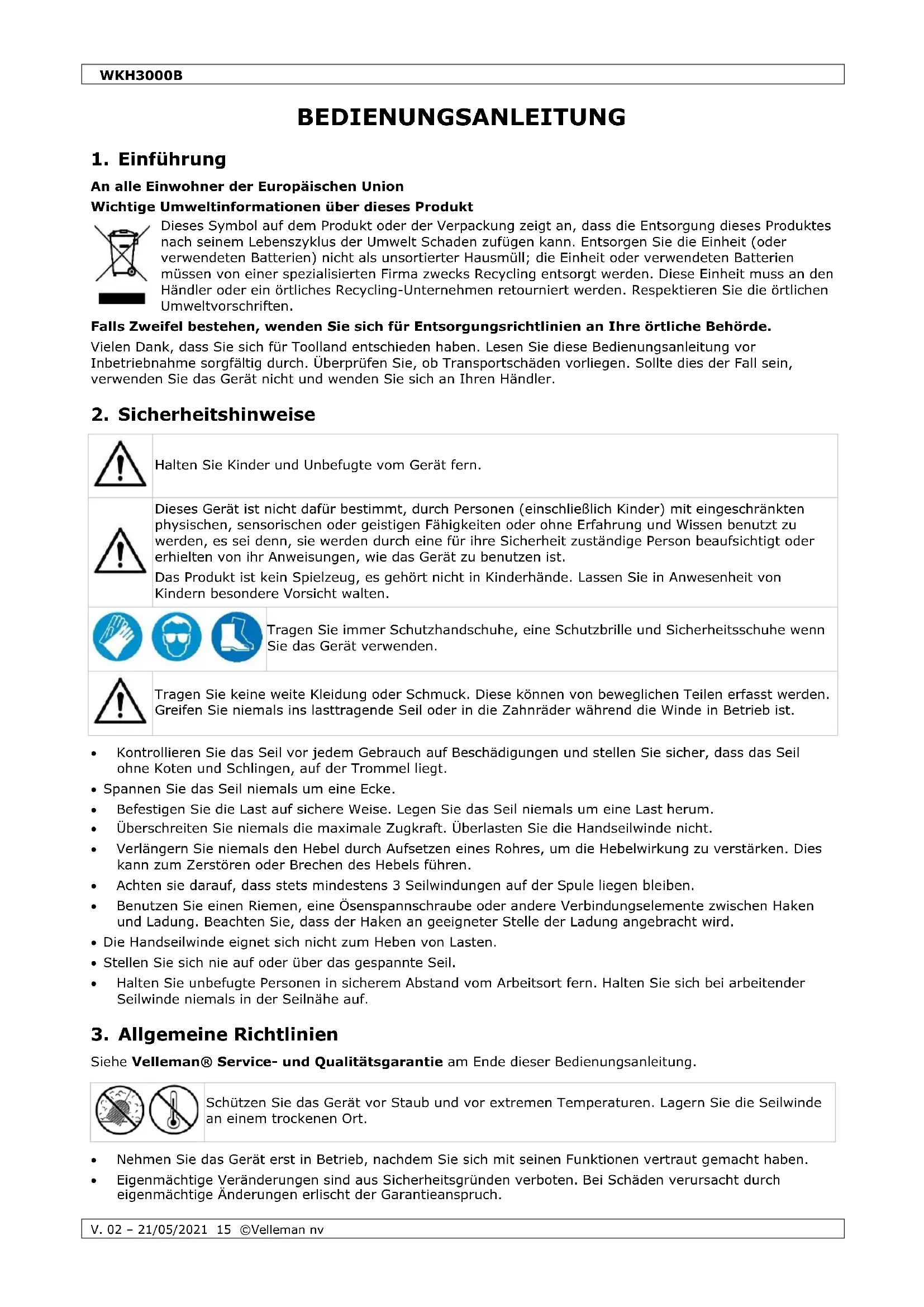 WKH3000B - Winde Toolland - Kostenlose Bedienungsanleitung