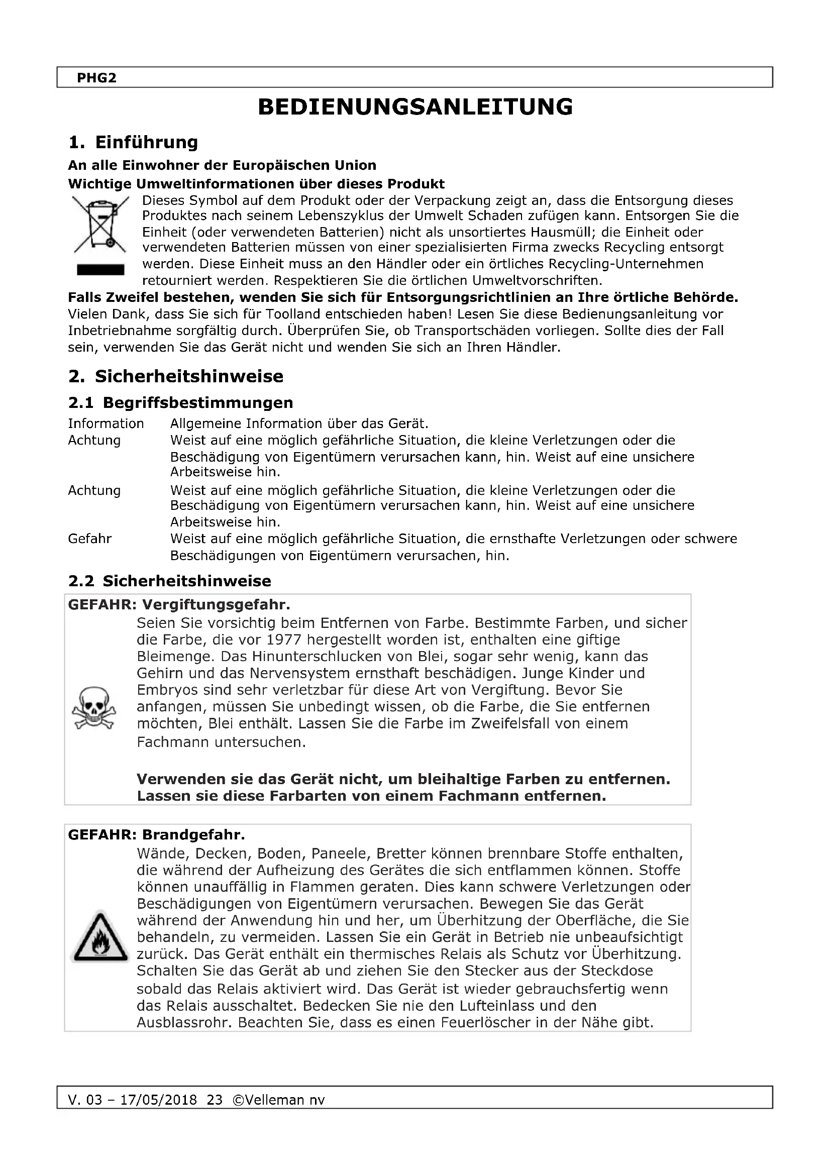 Finden Sie kostenlos die Bedienungsanleitung des Geräts PHG2 Toolland als PDF.