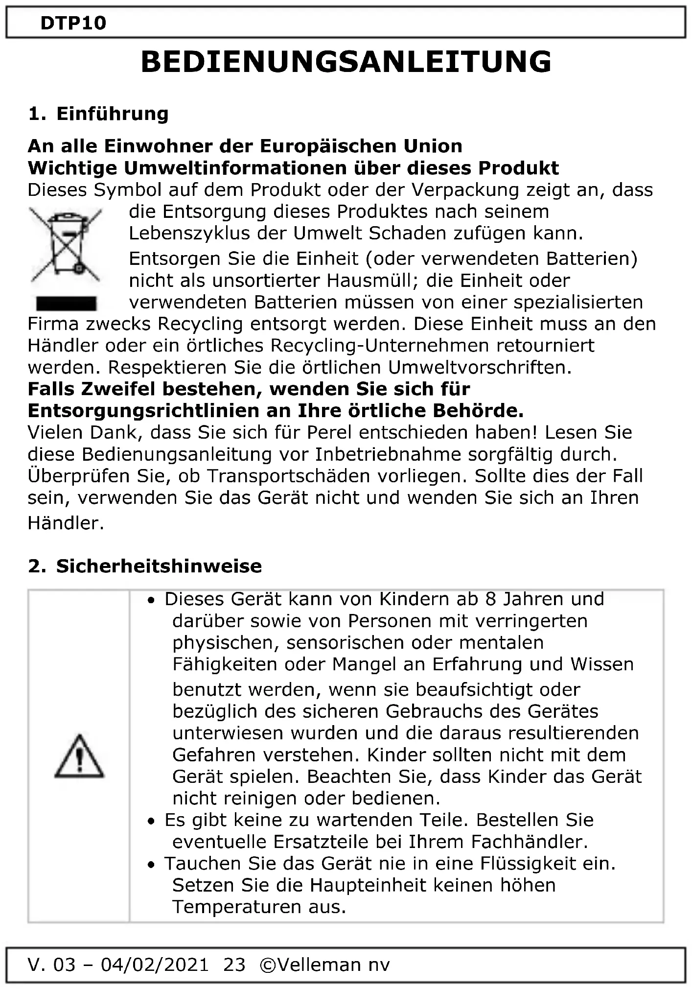RED Konformitätserklärung Hiermit erklärt Velleman NV, dass der Funkanlagentyp [DTP10] der Richtlinie 2014/53/EU entspricht. Der vollständige Text der EU-Konformitätserklärung ist unter der folgenden Internetadresse verfügbar: www.velleman.eu.