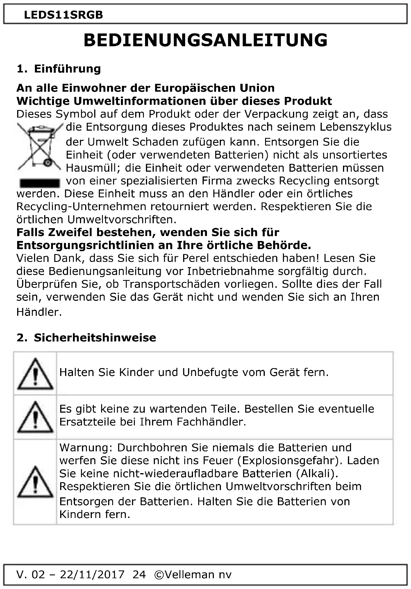 Warnung: Durchbohren Sie niemals die Batterien und werfen Sie diese nicht ins Feuer (Explosionsgefahr). Laden Sie keine nicht-wiederaufladbare Batterien (Alkali). Respektieren Sie die örtlichen Umweltvorschriften beim Entsorgen der Batterien. Halten Sie die Batterien von Kindern fern.LEDS11SRGB