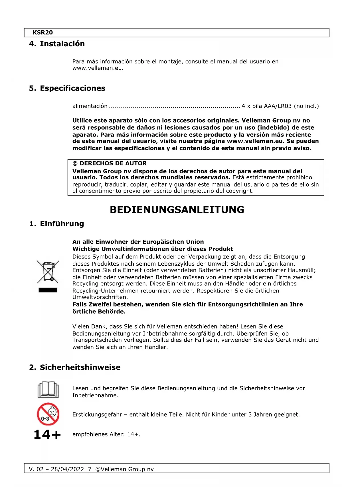 Velleman Group nv besitzt das Urheberrecht für diese Bedienungsanleitung. Alle weltweiten Rechte vorbehalten. Ohne vorherige schriftliche Genehmigung des Urhebers ist es nicht gestattet, diese Bedienungsanleitung ganz oder in Teilen zu reproduzieren, zu kopieren, zu übersetzen, zu bearbeiten oder zu speichern.KSR20