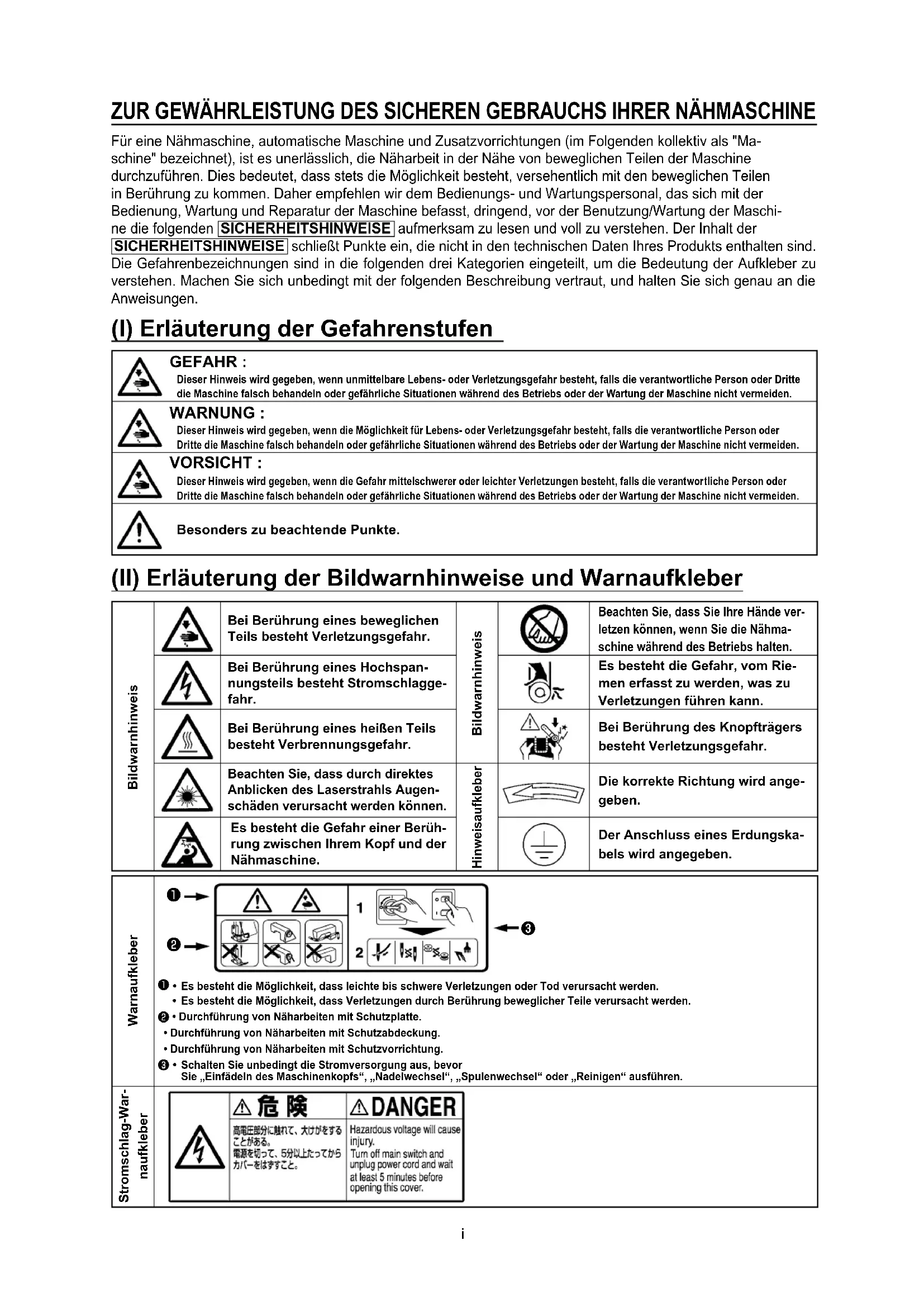 Schalten Sie unbedingt die Stromversorgung aus, bevor Sie „Einfädeln des Maschinenkopfs“, „Nadelwechsel“, „Spulenwechsel“ oder „Reinigen“ ausführen.Stromschlag-War-naufkleberBildwarnhinweisBei Berührung eines beweglichen Teils besteht Verletzungsgefahr.BildwarnhinweisBeachten Sie, dass Sie Ihre Hände ver-letzen können, wenn Sie die Nähma-schine während des Betriebs halten.Bei Berührung eines Hochspan-nungsteils besteht Stromschlagge-fahr.Es besteht die Gefahr, vom Rie-men erfasst zu werden, was zu Verletzungen führen kann.Bei Berührung eines heißen Teils besteht Verbrennungsgefahr.Bei Berührung des Knopfträgers besteht Verletzungsgefahr.Beachten Sie, dass durch direktes Anblicken des Laserstrahls Augen-schäden verursacht werden können.HinweisaufkleberDie korrekte Richtung wird ange-geben.Es besteht die Gefahr einer Berüh-rung zwischen Ihrem Kopf und der Nähmaschine.Der Anschluss eines Erdungska-bels wird angegeben. GEFAHR : Dieser Hinweis wird gegeben, wenn unmittelbare Lebens- oder Verletzungsgefahr besteht, falls die verantwortliche Person oder Dritte die Maschine falsch behandeln oder gefährliche Situationen während des Betriebs oder der Wartung der Maschine nicht vermeiden. WARNUNG : Dieser Hinweis wird gegeben, wenn die Möglichkeit für Lebens- oder Verletzungsgefahr besteht, falls die verantwortliche Person oder Dritte die Maschine falsch behandeln oder gefährliche Situationen während des Betriebs oder der Wartung der Maschine nicht vermeiden. VORSICHT : Dieser Hinweis wird gegeben, wenn die Gefahr mittelschwerer oder leichter Verletzungen besteht, falls die verantwortliche Person oder Dritte die Maschine falsch behandeln oder gefährliche Situationen während des Betriebs oder der Wartung der Maschine nicht vermeiden. Besonders zu beachtende Punkte. (I) Erläuterung der Gefahrenstufen ZUR GEWÄHRLEISTUNG DES SICHEREN GEBRAUCHS IHRER NÄHMASCHINEii