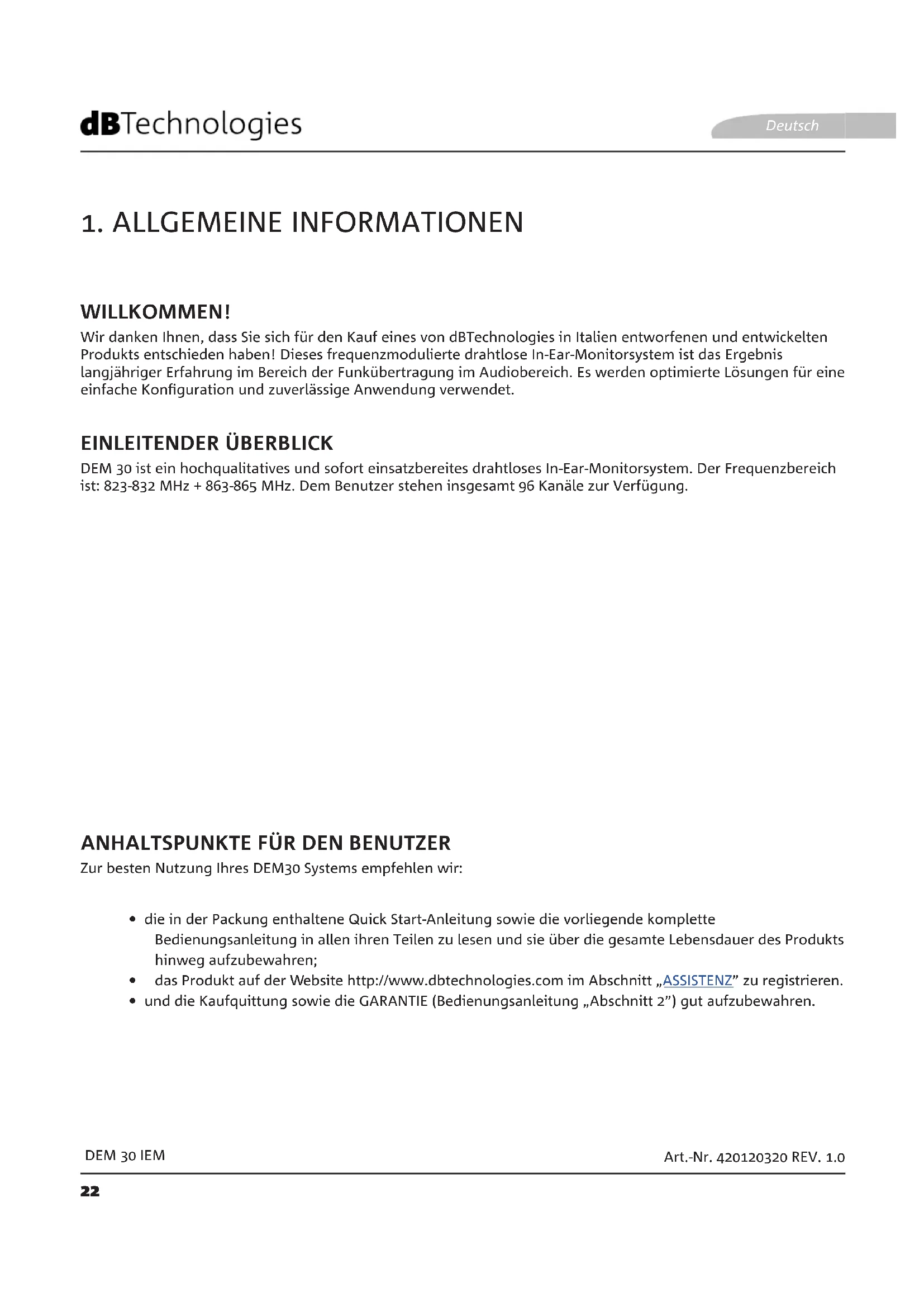 Wir danken Ihnen, dass Sie sich für den Kauf eines von dBTechnologies in Italien entworfenen und entwickelten Produkts entschieden haben! Dieses frequenzmodulierte drahtlose In-Ear-Monitorsystem ist das Ergebnis langjähriger Erfahrung im Bereich der Funkübertragung im Audiobereich. Es werden optimierte Lösungen für eine einfache Konguration und zuverlässige Anwendung verwendet. DEM 30 ist ein hochqualitatives und sofort einsatzbereites drahtloses In-Ear-Monitorsystem. Der Frequenzbereich ist: 823-832 MHz + 863-865 MHz. Dem Benutzer stehen insgesamt 96 Kanäle zur Verfügung. Zur besten Nutzung Ihres DEM30 Systems empfehlen wir: