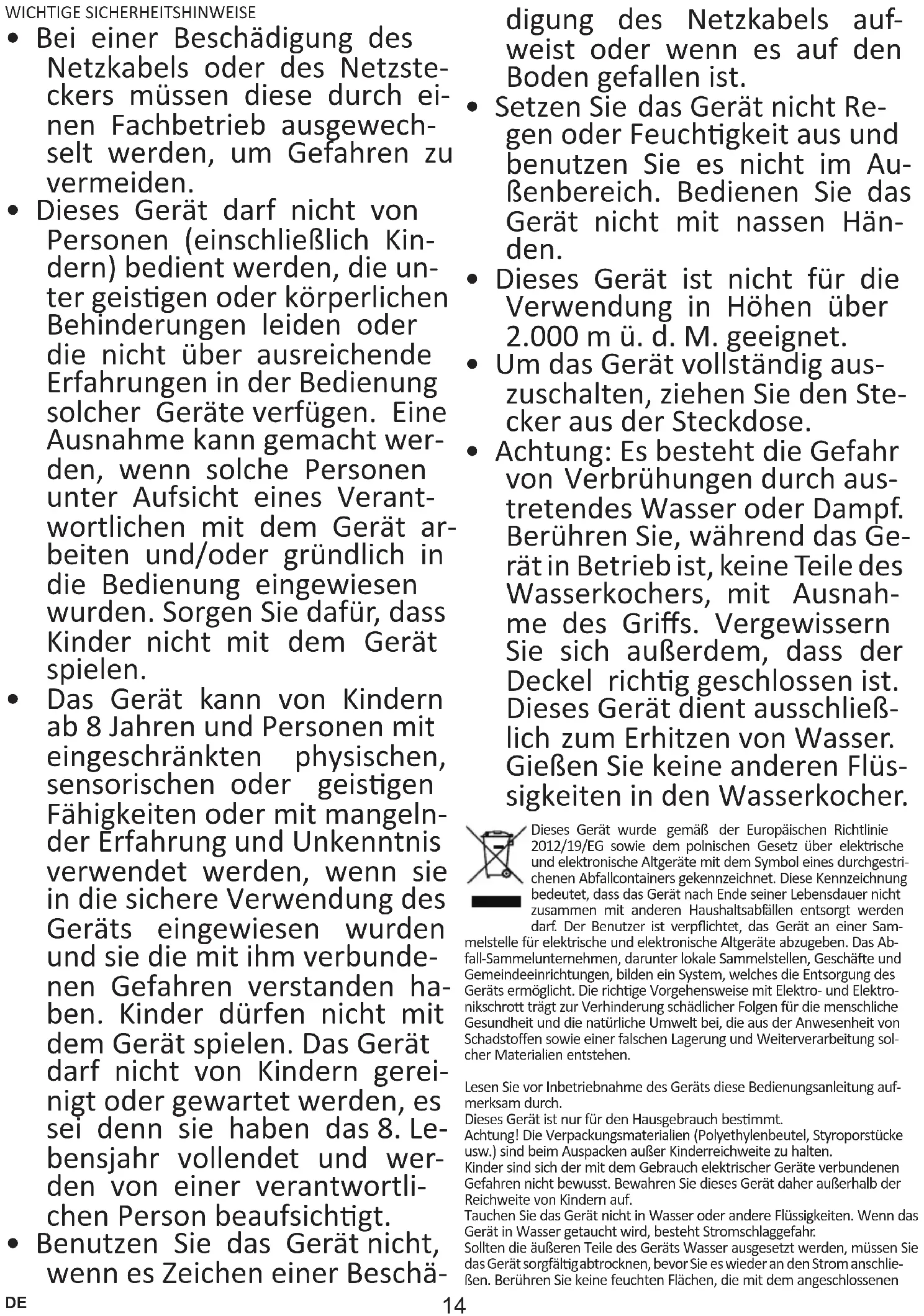 - Achtung: Es besteht die Gefahr von Verbrühungen durch aus- tretendes Wasser oder Dampf. Berühren Sie, während das Ge- rät in Betrieb ist, keine Teile des Wasserkochers, mit Ausnah- me des Gris. Vergewissern Sie sich außerdem, dass der Deckel richg geschlossen ist. Dieses Gerät dient ausschließ- lich zum Erhitzen von Wasser. Gießen Sie keine anderen Flüs- sigkeiten in den Wasserkocher. Dieses Gerät wurde gemäß der Europäischen Richtlinie 2012/19/EG sowie dem polnischen Gesetz über elektrische und elektronische Altgeräte mit dem Symbol eines durchgestri- chenen Abfallcontainers gekennzeichnet. Diese Kennzeichnung bedeutet, dass das Gerät nach Ende seiner Lebensdauer nicht zusammen mit anderen Haushaltsabfällen entsorgt werden darf. Der Benutzer ist verpichtet, das Gerät an einer Sam- melstelle für elektrische und elektronische Altgeräte abzugeben. Das Ab- fallSammelunternehmen, darunter lokale Sammelstellen, Geschäe und Gemeindeeinrichtungen, bilden ein System, welches die Entsorgung des Geräts ermöglicht. Die richge Vorgehensweise mit Elektro und Elektro- nikschro trägt zur Verhinderung schädlicher Folgen für die menschliche Gesundheit und die natürliche Umwelt bei, die aus der Anwesenheit von Schadstoen sowie einer falschen Lagerung und Weiterverarbeitung sol- cher Materialien entstehen. Lesen Sie vor Inbetriebnahme des Geräts diese Bedienungsanleitung auf- merksam durch. Dieses Gerät ist nur für den Hausgebrauch besmmt. Achtung! Die Verpackungsmaterialien (Polyethylenbeutel, Styroporstücke usw.) sind beim Auspacken außer Kinderreichweite zu halten. Kinder sind sich der mit dem Gebrauch elektrischer Geräte verbundenen Gefahren nicht bewusst. Bewahren Sie dieses Gerät daher außerhalb der Reichweite von Kindern auf. Tauchen Sie das Gerät nicht in Wasser oder andere Flüssigkeiten. Wenn das Gerät in Wasser getaucht wird, besteht Stromschlaggefahr. Sollten die äußeren Teile des Geräts Wasser ausgesetzt werden, müssen Sie das Gerät sorgfälg abtrocknen, bevor Sie es wieder an den Strom anschlie- ßen. Berühren Sie keine feuchten Flächen, die mit dem angeschlossenen15