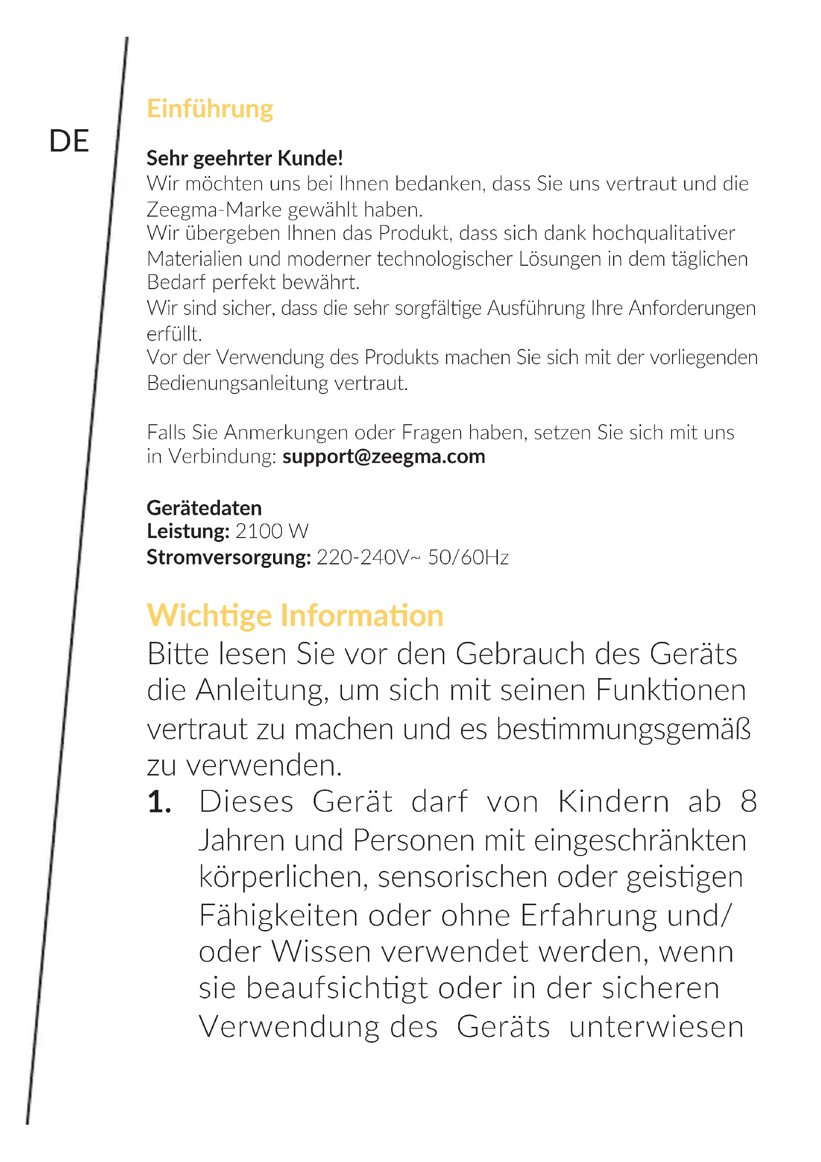 - Aer each use of the device, remove and empty the drip tray (9, g. A). The tray should be washed with warm water using a mild detergent and then dried with a so cloth. The photos are for reference only, the actual look of the products may dier from the ones shown in the pictures.DE Einführung Sehr geehrter Kunde! Wir möchten uns bei Ihnen bedanken, dass Sie uns vertraut und die Zeegma-Marke gewählt haben. Wir übergeben Ihnen das Produkt, dass sich dank hochqualitaver Materialien und moderner technologischer Lösungen in dem täglichen Bedarf perfekt bewährt. Wir sind sicher, dass die sehr sorgfälge Ausführung Ihre Anforderungen erfüllt. Vor der Verwendung des Produkts machen Sie sich mit der vorliegenden Bedienungsanleitung vertraut. Falls Sie Anmerkungen oder Fragen haben, setzen Sie sich mit uns in Verbindung: support@zeegma.com Gerätedaten Leistung: 2100 W Stromversorgung: 220-240V~ 50/60Hz Wichge Informaon Bie lesen Sie vor den Gebrauch des Geräts die Anleitung, um sich mit seinen Funkonen vertraut zu machen und es besmmungsgemäß zu verwenden.