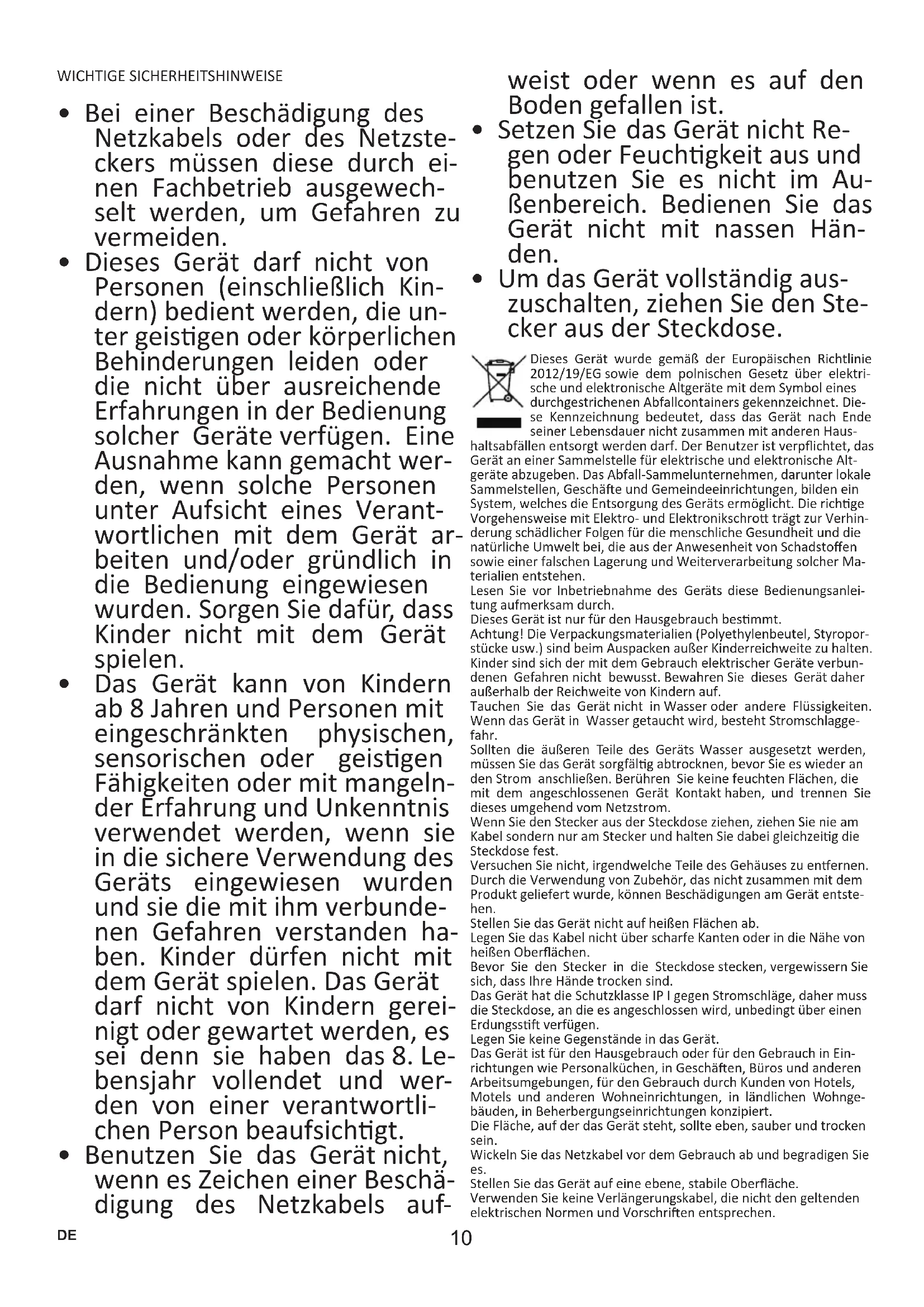 - Um das Gerät vollständig aus- zuschalten, ziehen Sie den Ste- cker aus der Steckdose. Dieses Gerät wurde gemäß der Europäischen Richtlinie 2012/19/EG sowie dem polnischen Gesetz über elektri- sche und elektronische Altgeräte mit dem Symbol eines durchgestrichenen Abfallcontainers gekennzeichnet. Die- se Kennzeichnung bedeutet, dass das Gerät nach Ende seiner Lebensdauer nicht zusammen mit anderen Haus- haltsabfällen entsorgt werden darf. Der Benutzer ist verpichtet, das Gerät an einer Sammelstelle für elektrische und elektronische Alt- geräte abzugeben. Das AbfallSammelunternehmen, darunter lokale Sammelstellen, Geschäe und Gemeindeeinrichtungen, bilden ein System, welches die Entsorgung des Geräts ermöglicht. Die richge Vorgehensweise mit Elektro und Elektronikschro trägt zur Verhin- derung schädlicher Folgen für die menschliche Gesundheit und die natürliche Umwelt bei, die aus der Anwesenheit von Schadstoen sowie einer falschen Lagerung und Weiterverarbeitung solcher Ma- terialien entstehen. Lesen Sie vor Inbetriebnahme des Geräts diese Bedienungsanlei- tung aufmerksam durch. Dieses Gerät ist nur für den Hausgebrauch besmmt. Achtung! Die Verpackungsmaterialien (Polyethylenbeutel, Styropor- stücke usw.) sind beim Auspacken außer Kinderreichweite zu halten. Kinder sind sich der mit dem Gebrauch elektrischer Geräte verbun- denen Gefahren nicht bewusst. Bewahren Sie dieses Gerät daher außerhalb der Reichweite von Kindern auf. Tauchen Sie das Gerät nicht in Wasser oder andere Flüssigkeiten. Wenn das Gerät in Wasser getaucht wird, besteht Stromschlagge- fahr. Sollten die äußeren Teile des Geräts Wasser ausgesetzt werden, müssen Sie das Gerät sorgfälg abtrocknen, bevor Sie es wieder an den Strom anschließen. Berühren Sie keine feuchten Flächen, die mit dem angeschlossenen Gerät Kontakt haben, und trennen Sie dieses umgehend vom Netzstrom. Wenn Sie den Stecker aus der Steckdose ziehen, ziehen Sie nie am Kabel sondern nur am Stecker und halten Sie dabei gleichzeig die Steckdose fest. Versuchen Sie nicht, irgendwelche Teile des Gehäuses zu enernen. Durch die Verwendung von Zubehör, das nicht zusammen mit dem Produkt geliefert wurde, können Beschädigungen am Gerät entste- hen. Stellen Sie das Gerät nicht auf heißen Flächen ab. Legen Sie das Kabel nicht über scharfe Kanten oder in die Nähe von heißen Oberächen. Bevor Sie den Stecker in die Steckdose stecken, vergewissern Sie sich, dass Ihre Hände trocken sind. Das Gerät hat die Schutzklasse IP I gegen Stromschläge, daher muss die Steckdose, an die es angeschlossen wird, unbedingt über einen Erdungss verfügen. Legen Sie keine Gegenstände in das Gerät. Das Gerät ist für den Hausgebrauch oder für den Gebrauch in Ein- richtungen wie Personalküchen, in Geschäen, Büros und anderen Arbeitsumgebungen, für den Gebrauch durch Kunden von Hotels, Motels und anderen Wohneinrichtungen, in ländlichen Wohnge- bäuden, in Beherbergungseinrichtungen konzipiert. Die Fläche, auf der das Gerät steht, sollte eben, sauber und trocken sein. Wickeln Sie das Netzkabel vor dem Gebrauch ab und begradigen Sie es. Stellen Sie das Gerät auf eine ebene, stabile Oberäche. Verwenden Sie keine Verlängerungskabel, die nicht den geltenden elektrischen Normen und Vorschrien entsprechen.11