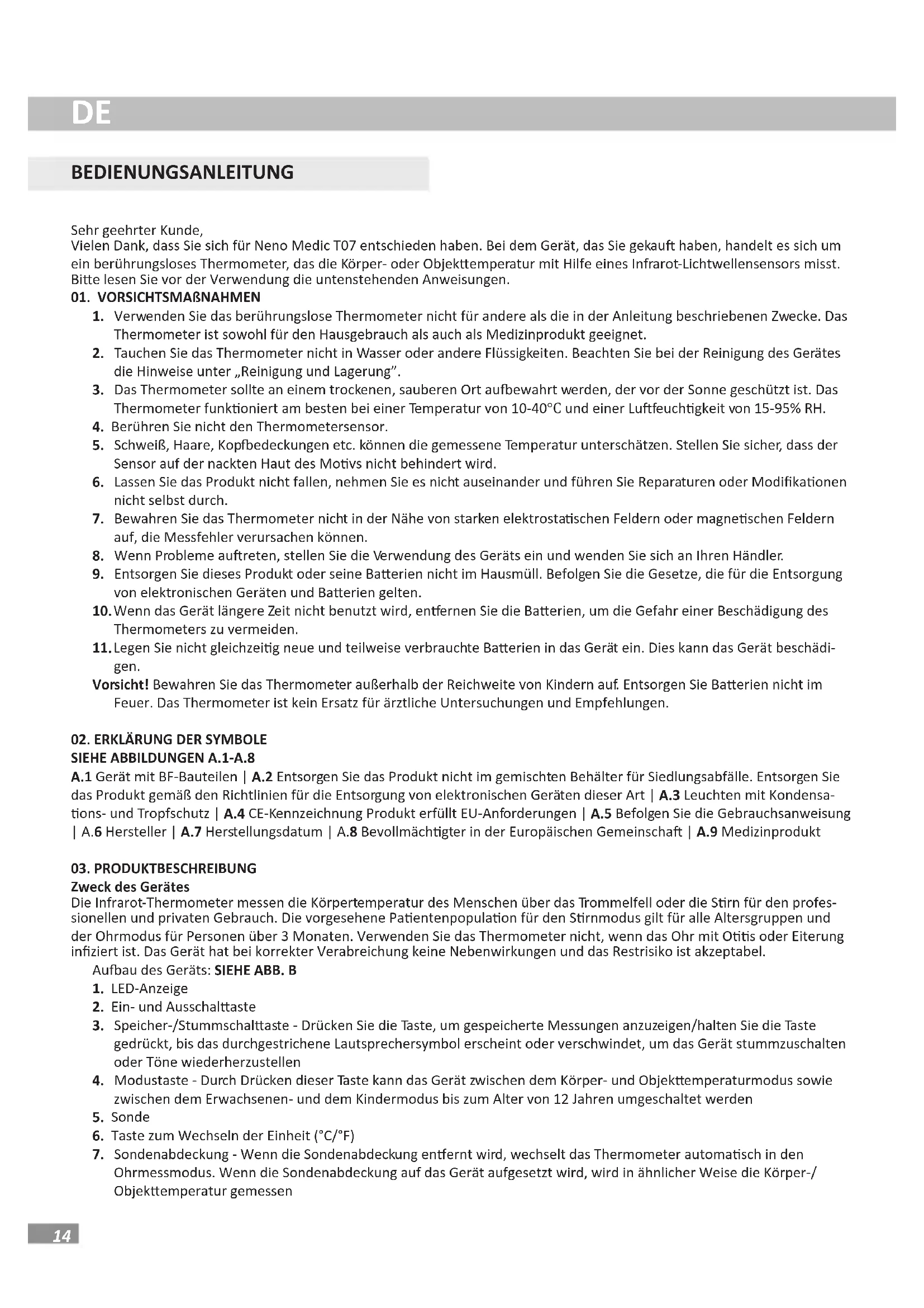 BEDIENUNGSANLEITUNG SehrgeehrterKunde, VielenDank,dassSiesichfürNenoMedicT07entschiedenhaben.BeidemGerät,dasSiegekauhaben,handeltessichum einberührungslosesThermometer,dasdieKörper-oderObjekemperaturmitHilfeeinesInfrarot-Lichtwellensensorsmisst. BielesenSievorderVerwendungdieuntenstehendenAnweisungen.