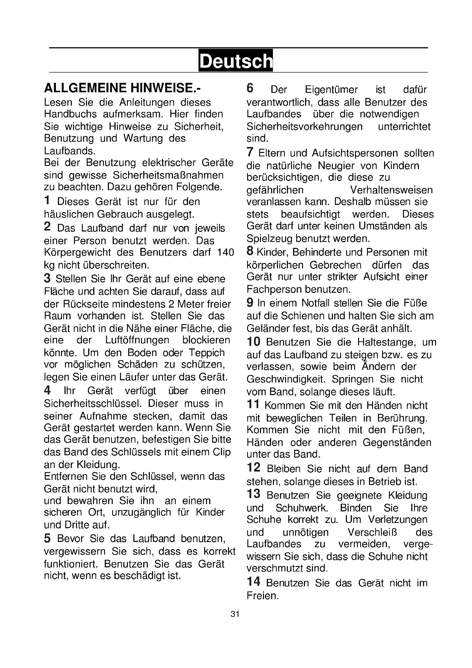 Deutsch ALLGEMEINE HINWEISE.- Lesen Sie die Anleitungen dieses Handbuchs aufmerksam. Hier finden Sie wichtige Hinweise zu Sicherheit, Benutzung und Wartung des Laufbands. Bei der Benutzung elektrischer Geräte sind gewisse Sicherheitsmaßnahmen zu beachten. Dazu gehören Folgende.