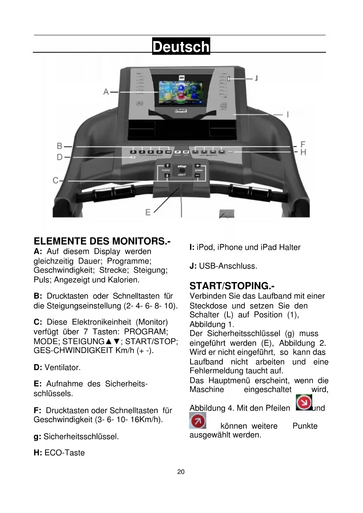 A: Auf diesem Display werden gleichzeitig Dauer; Programme; Geschwindigkeit; Strecke; Steigung; Puls; Angezeigt und Kalorien. B: Drucktasten oder Schnelltasten für die Steigungseinstellung (2- 4- 6- 8- 10). C: Diese Elektronikeinheit (Monitor) verfügt über 7 Tasten: PROGRAM; MODE; STEIGUNG▲▼; START/STOP; GES-CHWINDIGKEIT Km/h (+ -). D: Ventilator. E: Aufnahme des Sicherheits- schlüssels. F: Drucktasten oder Schnelltasten für Geschwindigkeit (3- 6- 10- 16Km/h). g: Sicherheitsschlüssel. H: ECO-Taste I: iPod, iPhone und iPad Halter J: USB-Anschluss. START/STOPING.- Verbinden Sie das Laufband mit einer Steckdose und setzen Sie den Schalter (L) auf Position (1), Abbildung 1. Der Sicherheitsschlüssel (g) muss eingeführt werden (E), Abbildung 2. Wird er nicht eingeführt, so kann das Laufband nicht arbeiten und eine Fehlermeldung taucht auf. Das Hauptmenü erscheint, wenn die Maschine eingeschaltet wird, Abbildung 4. Mit den Pfeilen und können weitere Punkte ausgewählt werden.21