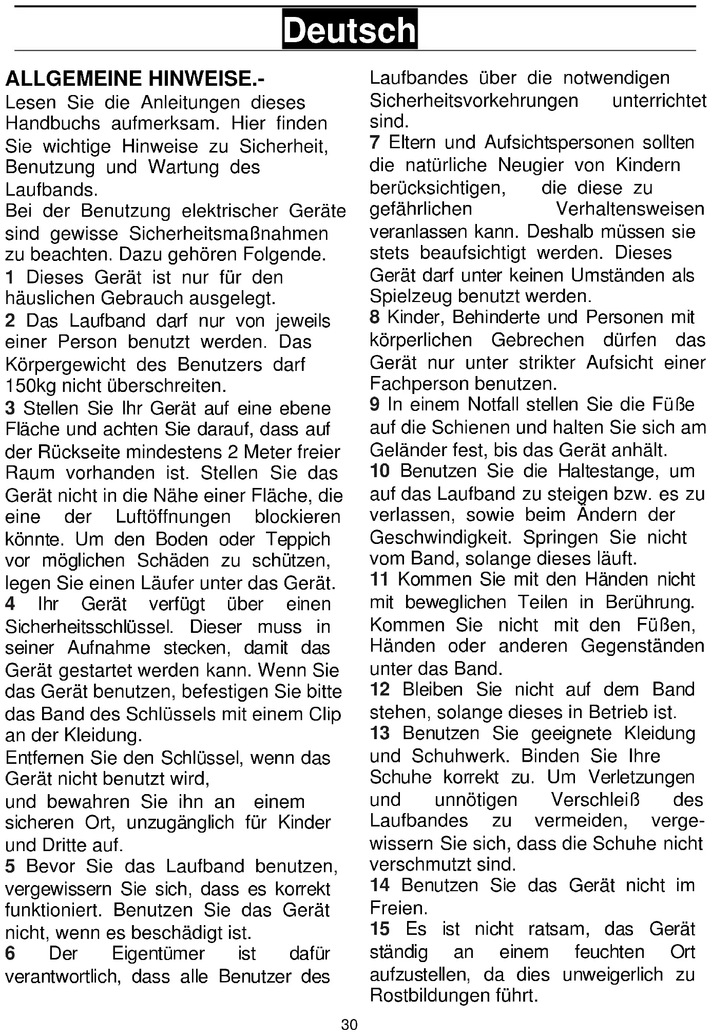 Deutsch ALLGEMEINE HINWEISE.- Lesen Sie die Anleitungen dieses Handbuchs aufmerksam. Hier finden Sie wichtige Hinweise zu Sicherheit, Benutzung und Wartung des Laufbands. Bei der Benutzung elektrischer Geräte sind gewisse Sicherheitsmaßnahmen zu beachten. Dazu gehören Folgende. 1 Dieses Gerät ist nur für den häuslichen Gebrauch ausgelegt. 2 Das Laufband darf nur von jeweils einer Person benutzt werden. Das Körpergewicht des Benutzers darf 150kg nicht überschreiten. 3 Stellen Sie Ihr Gerät auf eine ebene Fläche und achten Sie darauf, dass auf der Rückseite mindestens 2 Meter freier Raum vorhanden ist. Stellen Sie das Gerät nicht in die Nähe einer Fläche, die eine der Luftöffnungen blockieren könnte. Um den Boden oder Teppich vor möglichen Schäden zu schützen, legen Sie einen Läufer unter das Gerät. 4 Ihr Gerät verfügt über einen Sicherheitsschlüssel. Dieser muss in seiner Aufnahme stecken, damit das Gerät gestartet werden kann. Wenn Sie das Gerät benutzen, befestigen Sie bitte das Band des Schlüssels mit einem Clip an der Kleidung. Entfernen Sie den Schlüssel, wenn das Gerät nicht benutzt wird, und bewahren Sie ihn an einem sicheren Ort, unzugänglich für Kinder und Dritte auf. 5 Bevor Sie das Laufband benutzen, vergewissern Sie sich, dass es korrekt funktioniert. Benutzen Sie das Gerät nicht, wenn es beschädigt ist. 6 Der Eigentümer ist dafür verantwortlich, dass alle Benutzer des Laufbandes über die notwendigen Sicherheitsvorkehrungen unterrichtet sind. 7 Eltern und Aufsichtspersonen sollten die natürliche Neugier von Kindern berücksichtigen, die diese zu gefährlichen Verhaltensweisen veranlassen kann. Deshalb müssen sie stets beaufsichtigt werden. Dieses Gerät darf unter keinen Umständen als Spielzeug benutzt werden. 8 Kinder, Behinderte und Personen mit körperlichen Gebrechen dürfen das Gerät nur unter strikter Aufsicht einer Fachperson benutzen. 9 In einem Notfall stellen Sie die Füße auf die Schienen und halten Sie sich am Geländer fest, bis das Gerät anhält. 10 Benutzen Sie die Haltestange, um auf das Laufband zu steigen bzw. es zu verlassen, sowie beim Ändern der Geschwindigkeit. Springen Sie nicht vom Band, solange dieses läuft. 11 Kommen Sie mit den Händen nicht mit beweglichen Teilen in Berührung. Kommen Sie nicht mit den Füßen, Händen oder anderen Gegenständen unter das Band. 12 Bleiben Sie nicht auf dem Band stehen, solange dieses in Betrieb ist. 13 Benutzen Sie geeignete Kleidung und Schuhwerk. Binden Sie Ihre Schuhe korrekt zu. Um Verletzungen und unnötigen Verschleiß des Laufbandes zu vermeiden, verge- wissern Sie sich, dass die Schuhe nicht verschmutzt sind. 14 Benutzen Sie das Gerät nicht im Freien. 15 Es ist nicht ratsam, das Gerät ständig an einem feuchten Ort aufzustellen, da dies unweigerlich zu Rostbildungen führt.31