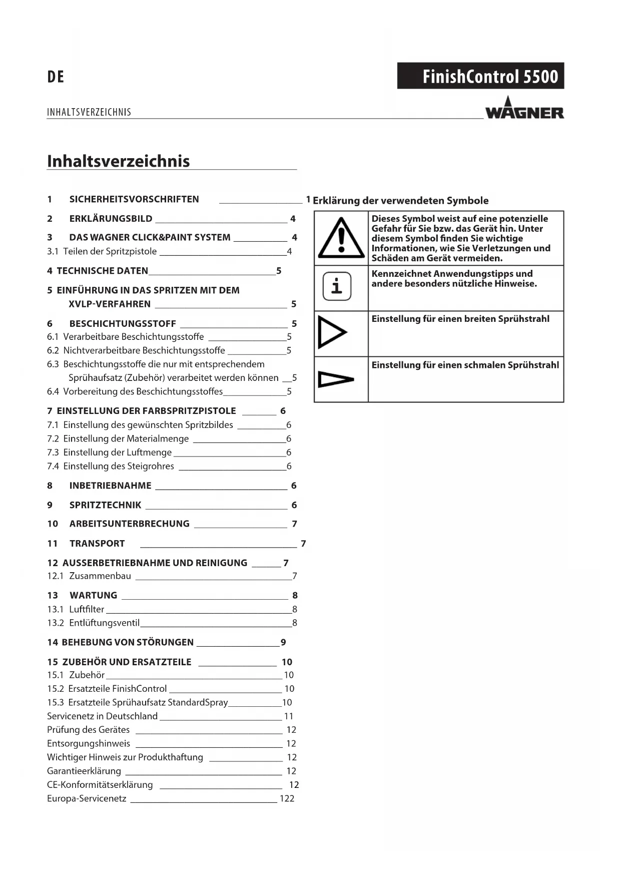 Laden Sie die Anleitung für Ihr Farbspray kostenlos im PDF-Format! Finden Sie Ihr Handbuch Finish Control 5500 - WAGNER und nehmen Sie Ihr elektronisches Gerät wieder in die Hand. Auf dieser Seite sind alle Dokumente veröffentlicht, die für die Verwendung Ihres Geräts notwendig sind. Finish Control 5500 von der Marke WAGNER.
