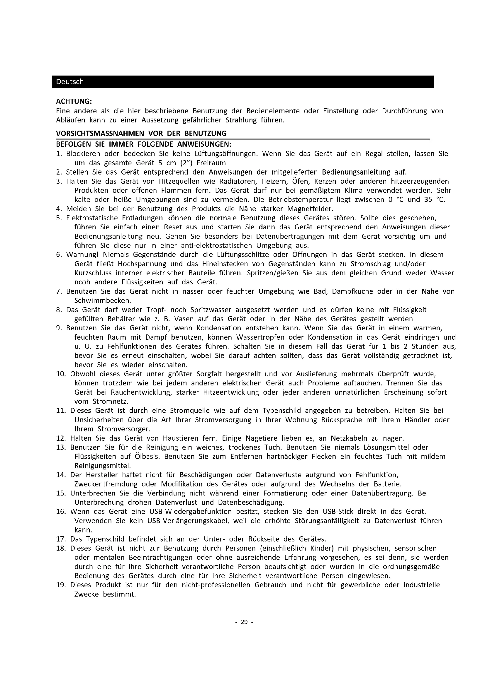 19. Dieses Produkt ist nur für den nicht-professionellen Gebrauch und nicht für gewerbliche oder industrielle