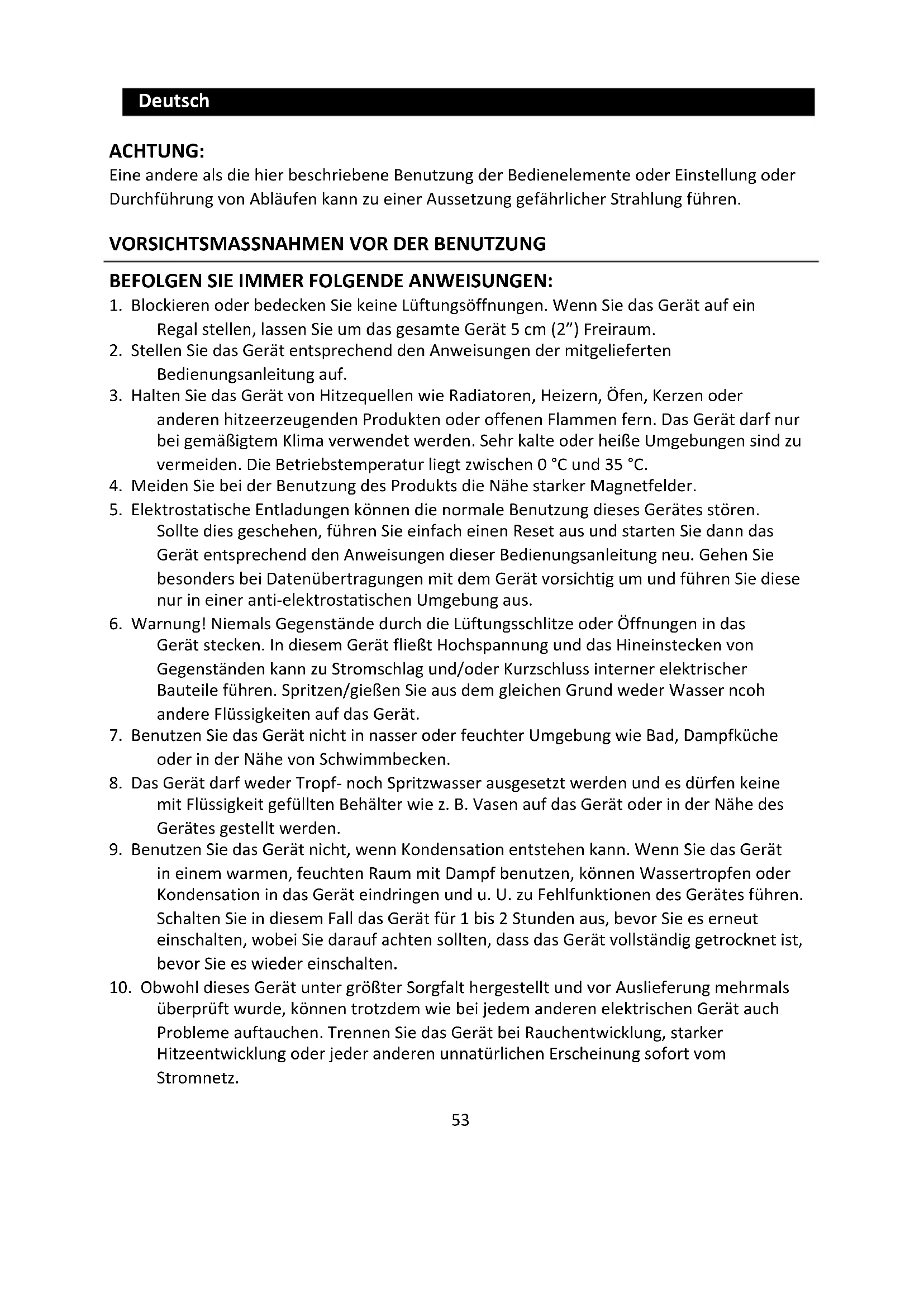 9. Benutzen Sie das Gerät nicht, wenn Kondensation entstehen kann. Wenn Sie das Gerät