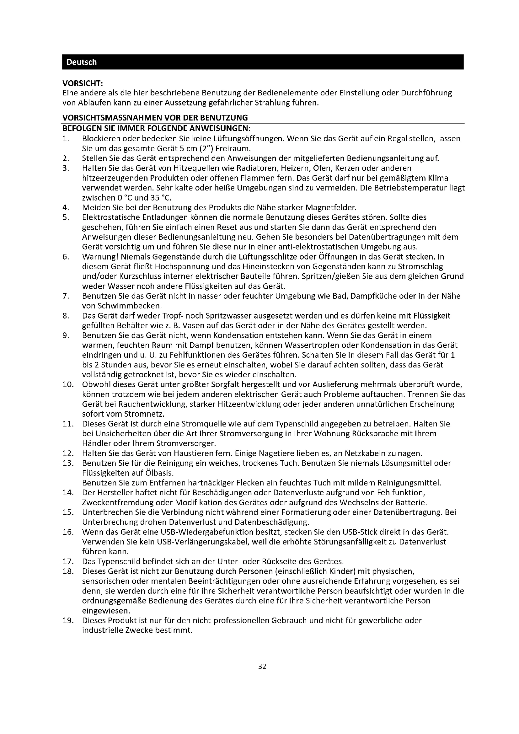 19. Dieses Produkt ist nur für den nicht-professionellen Gebrauch und nicht für gewerbliche oder