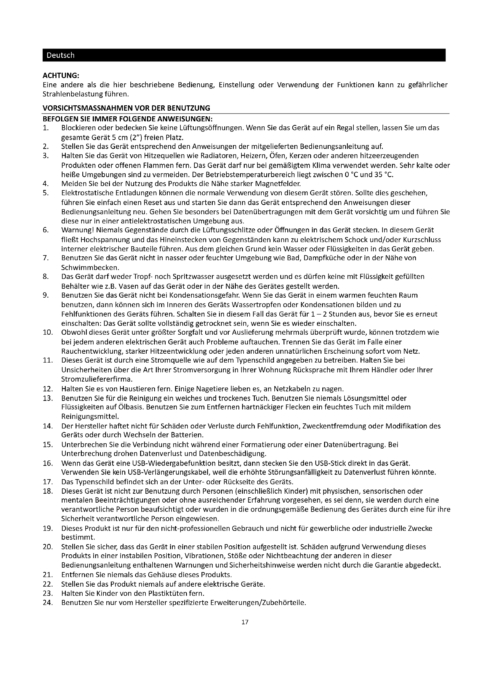 18. Dieses Gerät ist nicht zur Benutzung durch Personen (einschließlich Kinder) mit physischen, sensorischen oder