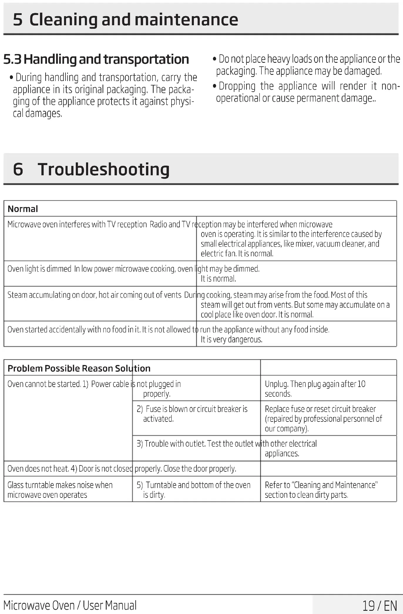 - Legen Sie keine schweren Lasten auf das Gerät oder auf die Verpackung. Das Gerät kann be- schädigt werden. 5 Reinigung und WartungMkrowellenherd / Bedenungsanletung 37 / DE Normal Mikrowellenherd verursacht Störungen des Fernsehempfangs Der Radio- und Fernsehempfang kann durch den Betrieb des Mikrowellenherdes gestört werden. Dies ähnelt den Störungen, die durch kleine Elektrogeräte, wie Mixer, Staubsauger und Ventilatoren, verursacht werden. Dies ist normal. Die Beleuchtung verdunkelt sich Arbeitet der Mikrowellenherd mit geringer Leistung, kann sich die Beleuchtung verdunkeln. Dies ist normal. Dampf sammelt sich an der Tür, heiße Luft kommt aus den Belüftungsöffnungen. Während des Garens kann Dampf von den Lebensmitteln aufsteigen. Ein Großteil dieses Dampfs tritt aus den Belüftungsöffnungen aus. Etwas Dampf kann sich jedoch auch an einer kühlen Stelle, wie z. B. der Tür, ansammeln. Dies ist normal. Gerät versehentlich im Leerzustand gestartet. Das Gerät darf nicht im Leerzustand (ohne Lebensmittel) betrieben werden. Das ist sehr gefährlich. Problem Mögliche Ursache Lösung Das Gerät kann nicht gestartet werden. 1) Das Netzkabel ist nicht richtig angeschlossen. Netzstecker ziehen. Nach 10 Sekunden wieder anschließen.