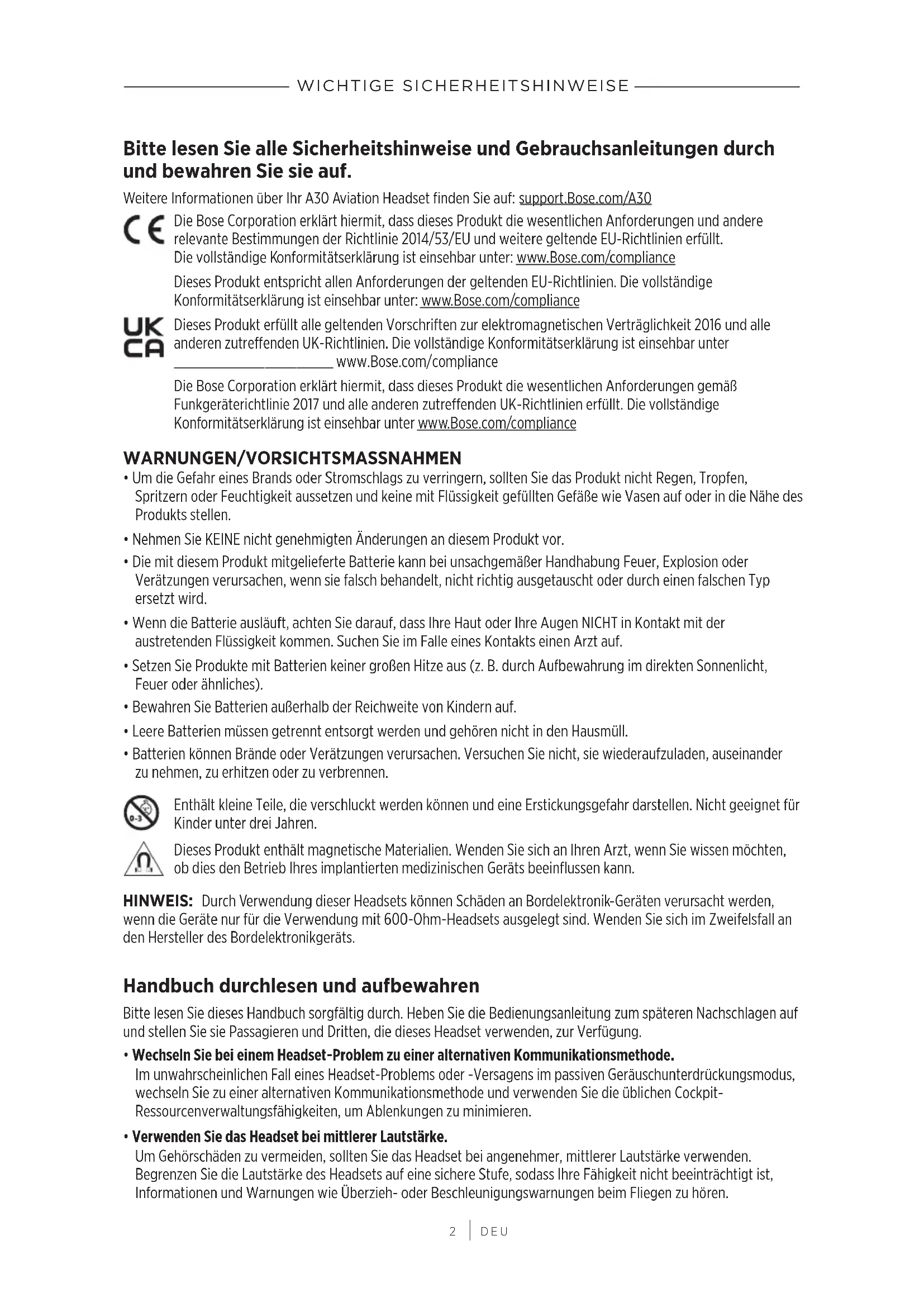 DEU WICHTIGE SICHERHEITSHINWEISE Bitte lesen Sie alle Sicherheitshinweise und Gebrauchsanleitungen durch und bewahren Sie sie auf. Weitere Informationen über Ihr A30 Aviation Headset finden Sie auf: support.Bose.com/A30support.Bose.com/A30 Die Bose Corporation erklärt hiermit, dass dieses Produkt die wesentlichen Anforderungen und andere relevante Bestimmungen der Richtlinie 2014/53/EU und weitere geltende EU-Richtlinien erfüllt. Dievollständige Konformitätserklärung ist einsehbar unter: www.Bose.com/compliancewww.Bose.com/compliance Dieses Produkt entspricht allen Anforderungen der geltenden EU-Richtlinien. Die vollständige Konformitätserklärung ist einsehbar unter: www.Bose.com/compliancewww.Bose.com/compliance Dieses Produkt erfüllt alle geltenden Vorschriften zur elektromagnetischen Verträglichkeit 2016 und alle anderen zutreffenden UK-Richtlinien. Die vollständige Konformitätserklärung ist einsehbar unter www.Bose.com/compliancewww.Bose.com/compliance Die Bose Corporation erklärt hiermit, dass dieses Produkt die wesentlichen Anforderungen gemäß Funkgeräterichtlinie 2017 und alle anderen zutreffenden UK-Richtlinien erfüllt. Die vollständige Konformitätserklärung ist einsehbar unter www.Bose.com/compliancewww.Bose.com/compliance WARNUNGEN/VORSICHTSMASSNAHMEN