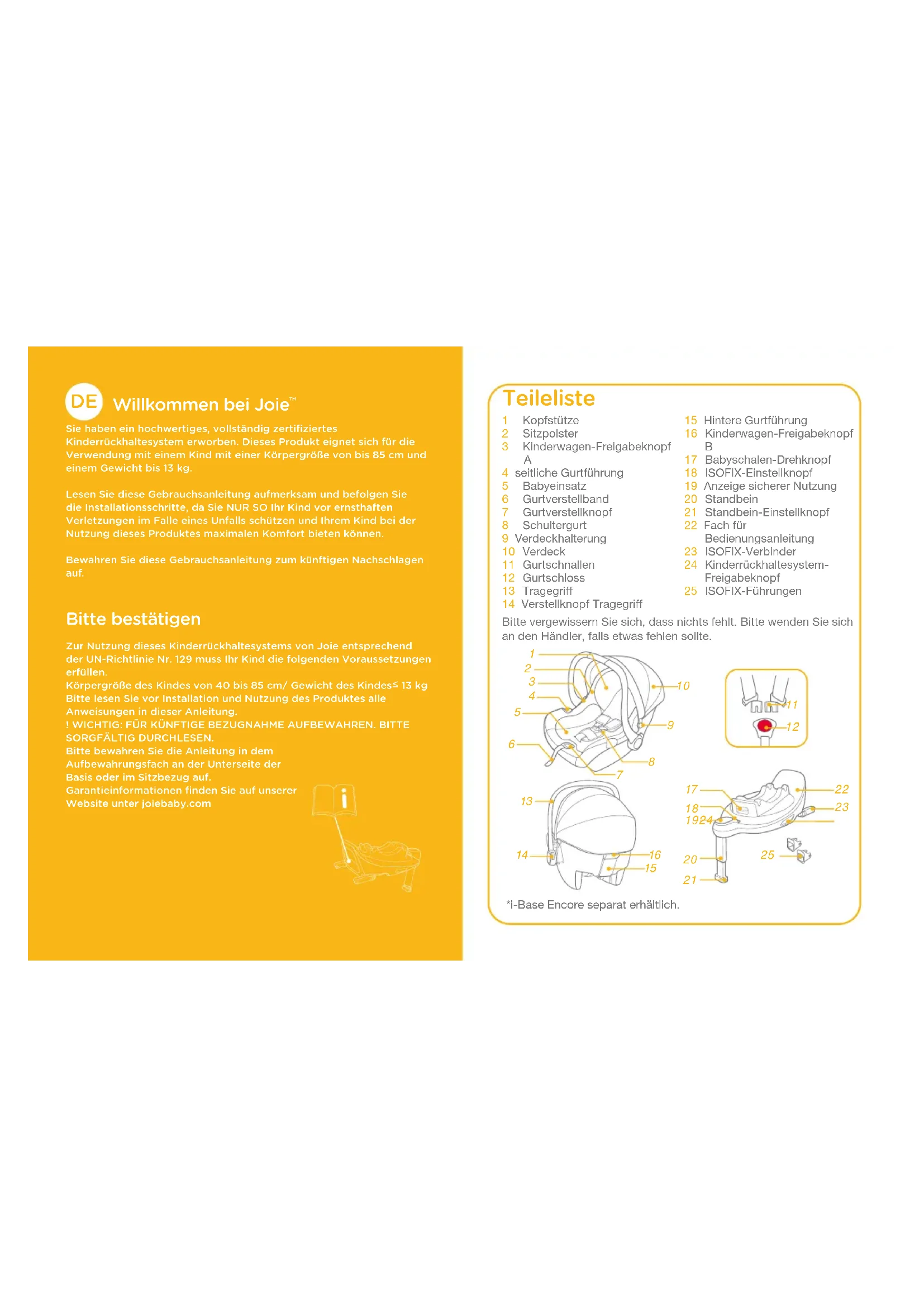 Sie haben ein hochwertiges﹐ vollständig zertifiziertes Kinderrückhaltesystem erworben. Dieses Produkt eignet sich für die Verwendung mit einem Kind mit einer Körpergröße von bis 85 cm und einem Gewicht bis 13 kg.Lesen Sie diese Gebrauchsanleitung aufmerksam und befolgen Sie die Installationsschritte﹐ da Sie NUR SO Ihr Kind vor ernsthaften Verletzungen im Falle eines Unfalls schützen und Ihrem Kind bei der Nutzung dieses Produktes maximalen Komfort bieten können.Bewahren Sie diese Gebrauchsanleitung zum künftigen Nachschlagen auf. Bitte bestätigen Zur Nutzung dieses Kinderrückhaltesystems von Joie entsprechend der UN-Richtlinie Nr. 129 muss Ihr Kind die folgenden Voraussetzungen erfüllen.Körpergröße des Kindes von 40 bis 85 cm/ Gewicht des Kindes 13 kgBitte lesen Sie vor Installation und Nutzung des Produktes alle Anweisungen in dieser Anleitung.! WICHTIG: FÜR KÜNFTIGE BEZUGNAHME AUFBEWAHREN. BITTE SORGFÄLTIG DURCHLESEN.Bitte bewahren Sie die Anleitung in dem Aufbewahrungsfach an der Unterseite der Basis oder im Sitzbezug auf.Garantieinformationen finden Sie auf unserer Website unter joiebaby.com *i-Base Encore separat erhältlich.