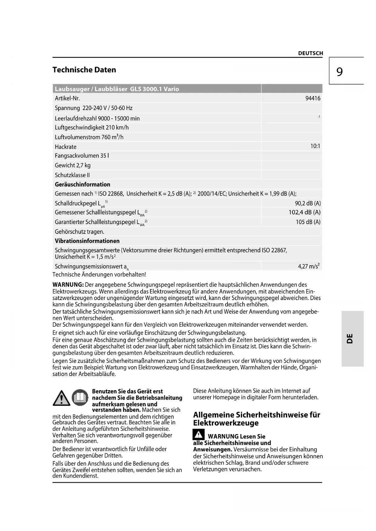 Technische Daten Laubsauger / Laubbläser GLS 3000.1 Vario Artikel-Nr.