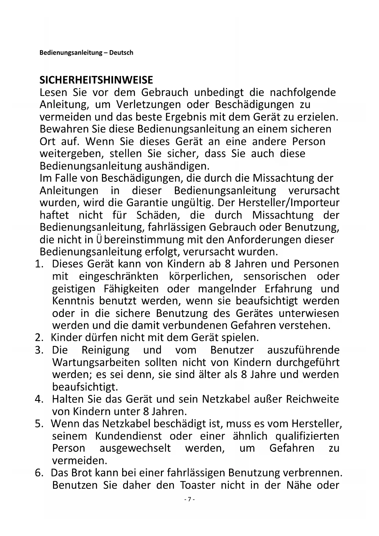 Benutzen Sie daher den Toaster nicht in der Nähe oder- 8 - unter brennbaren Materialien, wie zum Beispiel Vorhängen.