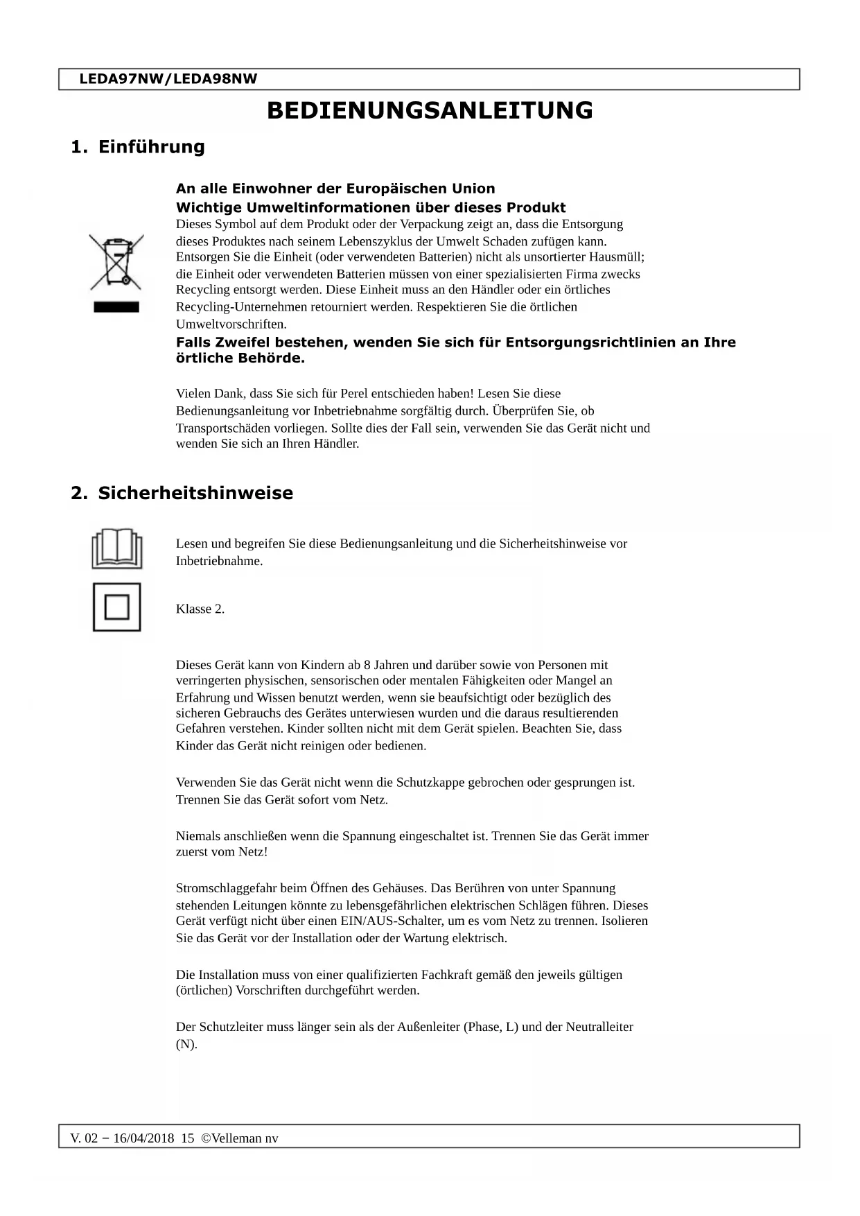 Verwenden Sie dieses Gerät nur mit originellen Zubehörteilen. Velleman NV übernimmt keine Haftung für Schaden oder Verletzungen bei (falscher) Anwendung dieses Gerätes. Mehr Informationen zu diesem Produkt und die neueste Version dieser Bedienungsanleitung finden Sie hier: www.perel.eu. Alle Änderungen ohne vorherige Ankündigung vorbehalten. © URHEBERRECHT Velleman NV besitzt das Urheberrecht für diese Bedienungsanleitung. Alle weltweiten Rechte vorbehalten. Ohne vorherige schriftliche Genehmigung des Urhebers ist es nicht gestattet, diese Bedienungsanleitung ganz oder in Teilen zu reproduzieren, zu kopieren, zu übersetzen, zu bearbeiten oder zu speichern.LEDA97NW/LEDA98NW