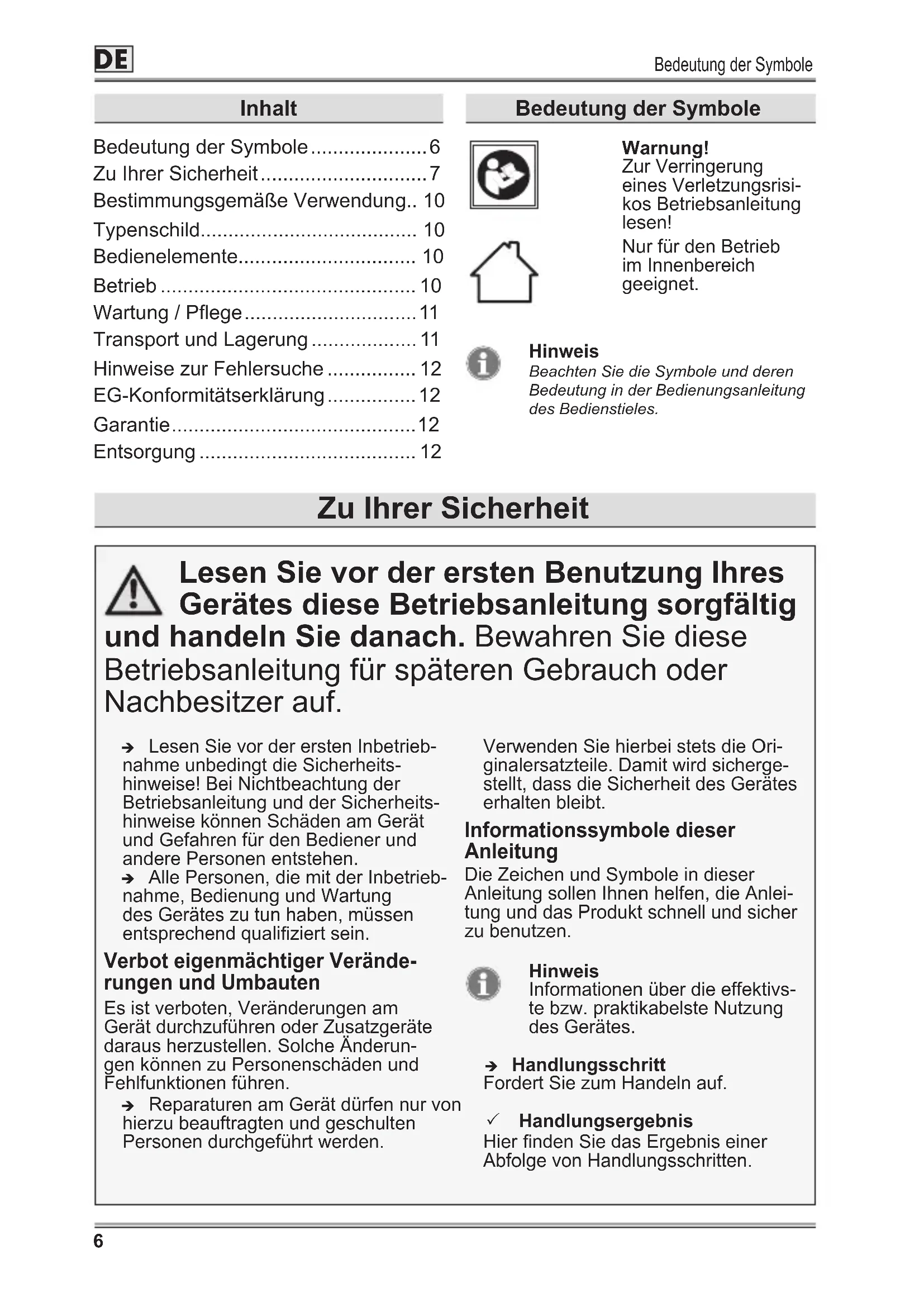 - Entsorgung Bedeutung der Symbole Zu Ihrer Sicherheit Lesen Sie vor der ersten Benutzung Ihres Gerätes diese Betriebsanleitung sorgfältig und handeln Sie danach. Bewahren Sie diese Betriebsanleitung für späteren Gebrauch oder Nachbesitzer auf. Î Lesen Sie vor der ersten Inbetrieb- nahme unbedingt die Sicherheits- hinweise! Bei Nichtbeachtung der Betriebsanleitung und der Sicherheits- hinweise können Schäden am Gerät und Gefahren für den Bediener und andere Personen entstehen. Î Alle Personen, die mit der Inbetrieb- nahme, Bedienung und Wartung des Gerätes zu tun haben, müssen entsprechend qualiziert sein. Verbot eigenmächtiger Verände- rungen und Umbauten Es ist verboten, Veränderungen am Gerät durchzuführen oder Zusatzgeräte daraus herzustellen. Solche Änderun- gen können zu Personenschäden und Fehlfunktionen führen. Î Reparaturen am Gerät dürfen nur von hierzu beauftragten und geschulten Personen durchgeführt werden. p. 12