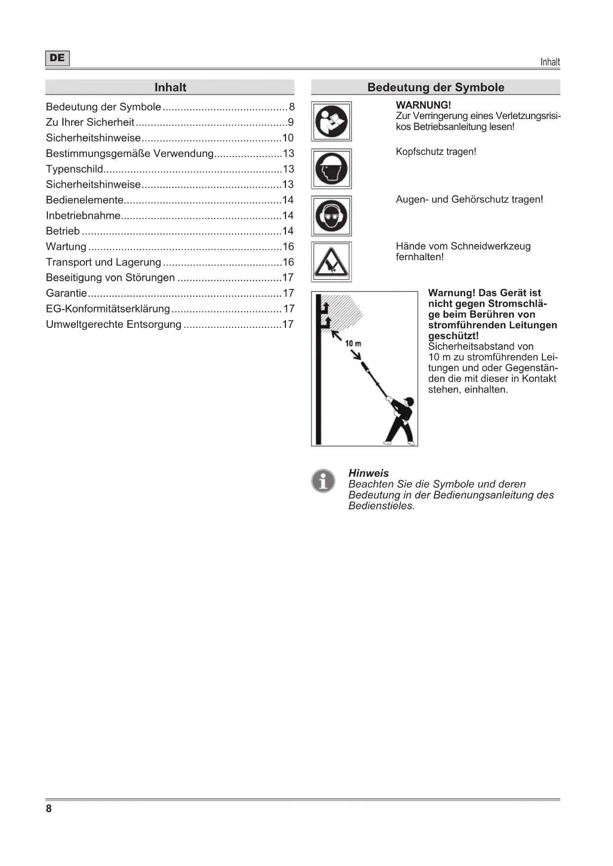 - Umweltgerechte Entsorgung Bedeutung der Symbole WARNUNG! Zur Verringerung eines Verletzungsrisi- kos Betriebsanleitung lesen! Kopfschutz tragen! Augen- und Gehörschutz tragen! Hände vom Schneidwerkzeug fernhalten! Warnung! Das Gerät ist nicht gegen Stromschlä- ge beim Berühren von stromführenden Leitungen geschützt! Sicherheitsabstand von 10 m zu stromführenden Lei- tungen und oder Gegenstän- den die mit dieser in Kontakt stehen, einhalten. Hinweis Beachten Sie die Symbole und deren Bedeutung in der Bedienungsanleitung des Bedienstieles.Bedeutung der Symbole p. 17