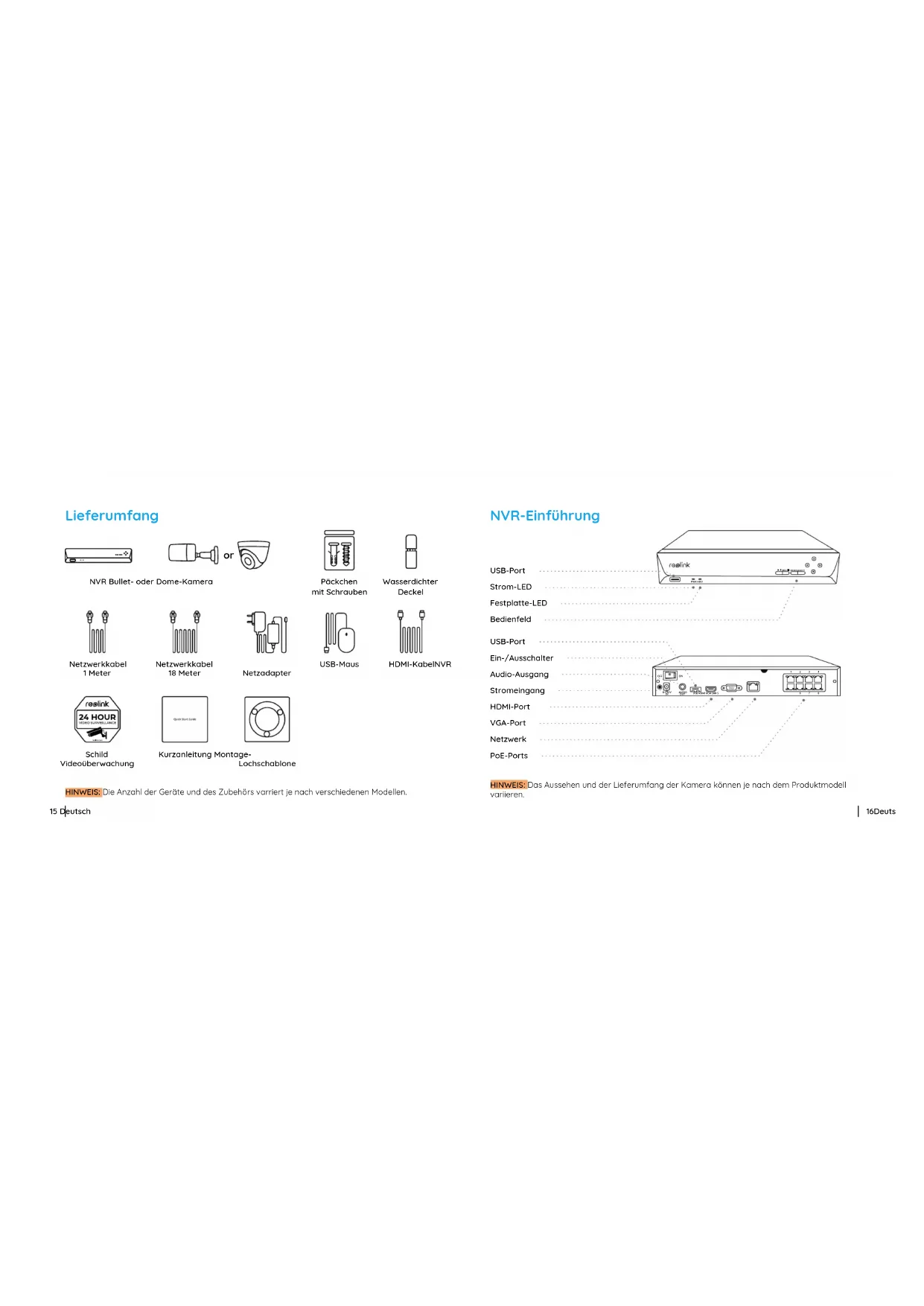 PWR HDD ALL MENU SELECT 16Deutsch 15 Deutsch NVR-Einführung USB-Port Strom-LED Festplatte-LED Bedienfeld USB-Port Ein-/Ausschalter Audio-Ausgang Stromeingang HDMI-Port VGA-Port Netzwerk PoE-Ports Lieferumfang HINWEIS: Die Anzahl der Geräte und des Zubehörs varriert je nach verschiedenen Modellen. HINWEIS: Das Aussehen und der Lieferumfang der Kamera können je nach dem Produktmodell variieren. HDMI-KabelNVR Netzadapter USB-Maus NVR Bullet- oder Dome-Kamera Schild Videoüberwachung Wasserdichter Deckel Päckchen mit Schrauben Netzwerkkabel 18 Meter Kurzanleitung Montage- Lochschablone Netzwerkkabel 1 Meter or18Deutsch17 Deutsch Kameras-Einführung Montagesockel Spotlight Tageslichtsensor Infrarot-Scheinwerfer Objektiv Internes Mikrofon Lautsprecher Wasserdichter Deckel Netzwerkkabel Reset-Taste Strom (Optional)