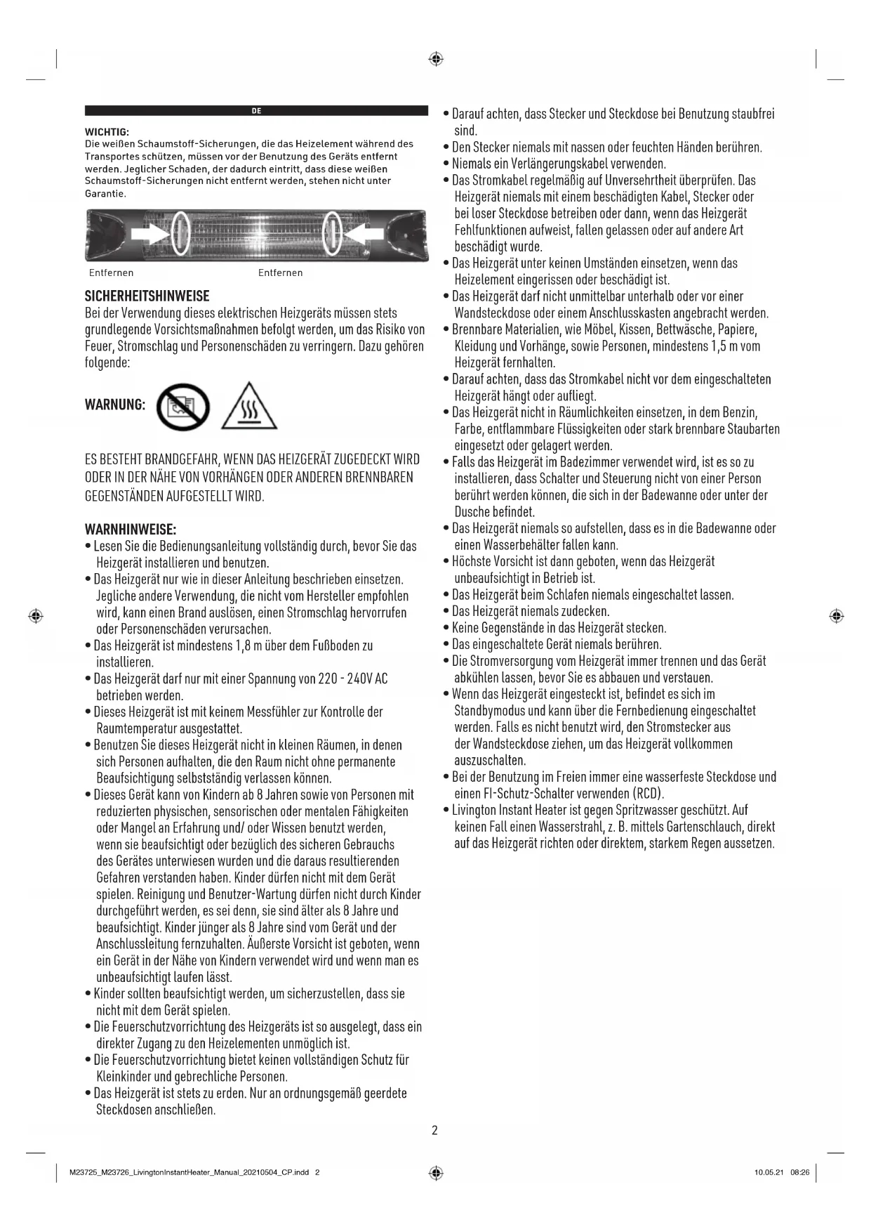 - Livington Instant Heater ist gegen Spritzwasser geschützt. Auf keinen Fall einen Wasserstrahl, z. B. mittels Gartenschlauch, direkt auf das Heizgerät richten oder direktem, starkem Regen aussetzen. M23725_M23726_LivingtonInstantHeater_Manual_20210504_CP.indd 2M23725_M23726_LivingtonInstantHeater_Manual_20210504_CP.indd 2 10.05.21 08:2610.05.21 08:263 EINLEITUNG: Ihr Livington Instant Heater ist ein robustes Heizgerät, das sich ausgezeichnet für den Einsatz im Innern und im Freien eignet. Ganz ohne Vorwärmzeit kann das Gerät direkt in Betrieb genommen werden. IM INNERN Im Rauminneren wärmt Livington Instant Heater nur Sie und Gegenstände, wie beispielsweise Teppiche und Möbel, auf. Da die Luft dabei nicht erwärmt wird, trocknet sie nicht aus. IM FREIEN Im Freien ist die Umgebungsluft konstant in Bewegung. Ein Umwälzheizer erweist sich hier als unpraktisch, da die erhitzte Luft einfach weggeblasen wird - der Heizeffekt, der Sie mit Wärme versorgen soll, wird somit restlos unterbunden. Livington Instant Heater ermöglicht es Ihnen jedoch, im Freien ganz bestimmte Bereiche zu erwärmen und Objekte und Menschen im Umfeld des Heizgeräts mit einer maximalen Heizeffizienz warm zu halten. WANDMONTAGE ACHTUNG: Das Gerät verfügt über einen Neigungssensor, der sicherstellt, dass Livington Instant Heater nur funktioniert, wenn er richtig montiert wurde. Wird der korrekte Neigungswinkel nicht eingehalten, z.B. Gerät hängt schief oder liegt am Boden, verhindert dieser Neigungssensor das Einschalten und der Fehler E2 bzw. 23 wird angezeigt. Ein Einschalten bzw. eine Bedienung von Livington Instant Heater ist erst wieder möglich, wenn dieser im richtigen Winkel montiert wurde.