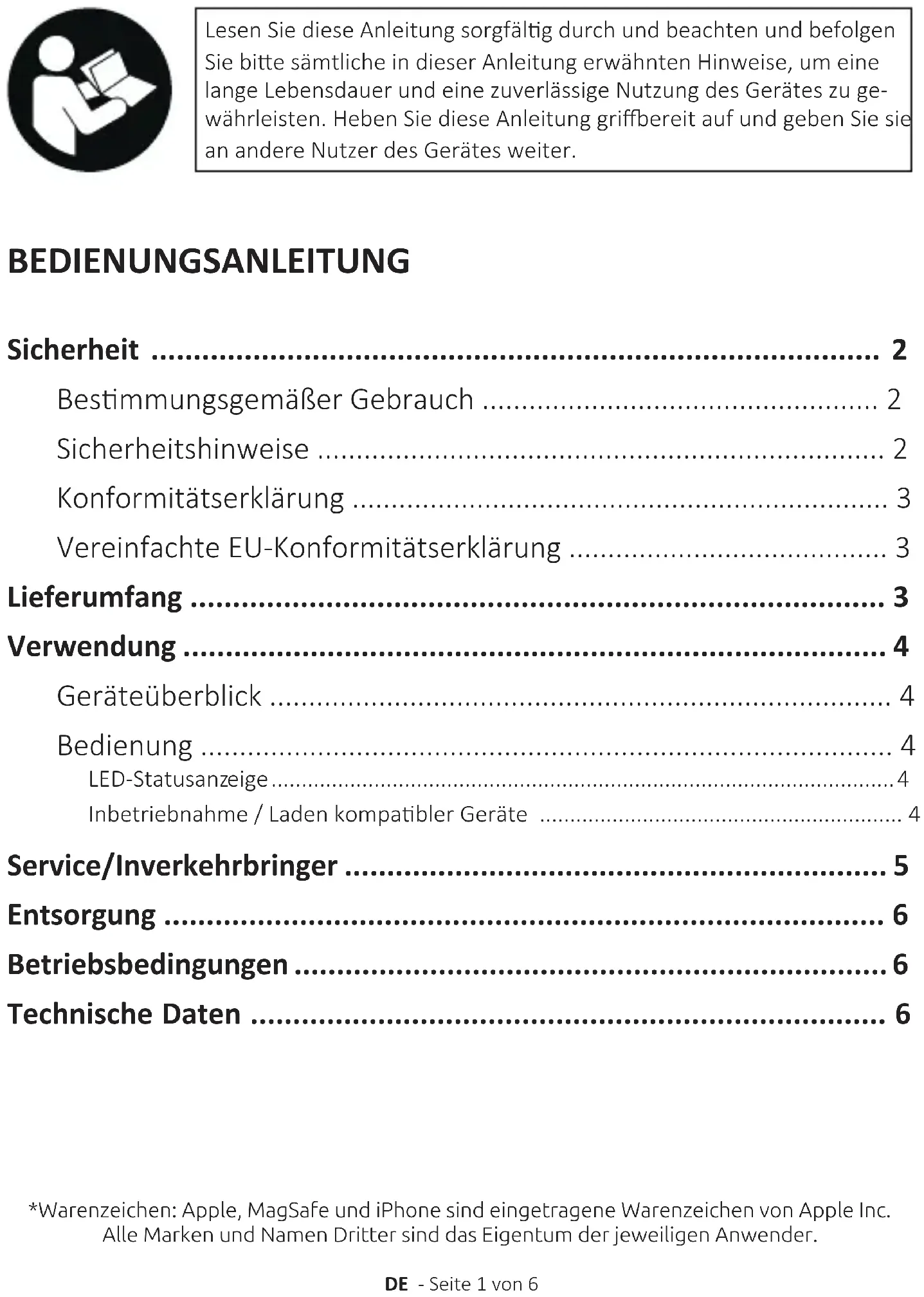 - MAGNETIC WIRELESS CHARGER BS13 User Manual Version 1.0 (22/11)1 2 3Lesen Sie diese Anleitung sorgfälg durch und beachten und befolgen Sie bie sämtliche in dieser Anleitung erwähnten Hinweise, um eine lange Lebensdauer und eine zuverlässige Nutzung des Gerätes zu ge- währleisten. Heben Sie diese Anleitung griereit auf und geben Sie sie an andere Nutzer des Gerätes weiter. BEDIENUNGSANLEITUNG Sicherheit p. 2