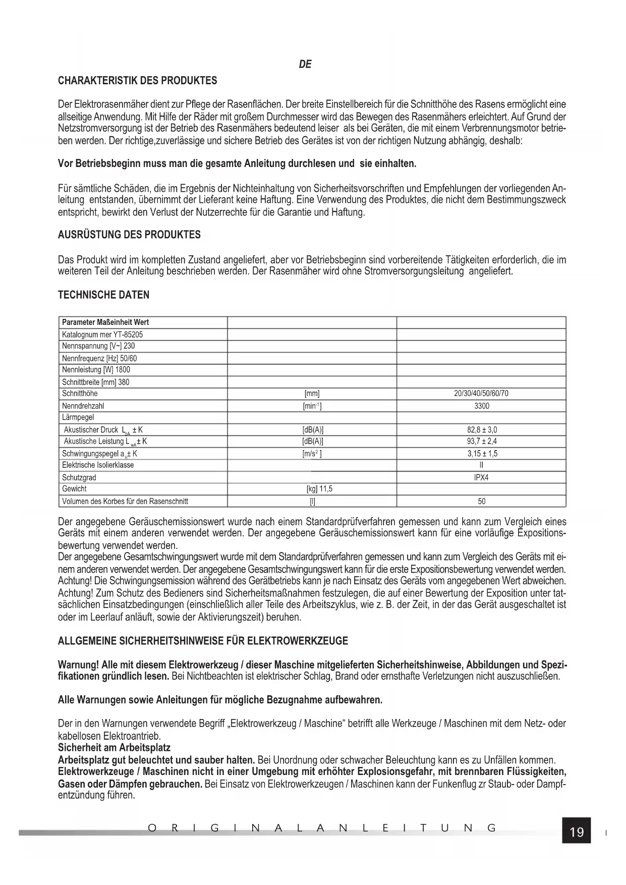 Das Produkt wird im kompletten Zustand angeliefert, aber vor Betriebsbeginn sind vorbereitende Tätigkeiten erforderlich, die im weiteren Teil der Anleitung beschrieben werden. Der Rasenmäher wird ohne Stromversorgungsleitung angeliefert. TECHNISCHE DATEN Parameter Maßeinheit Wert Katalognum mer YT-85205 Nennspannung [V~] 230 Nennfrequenz [Hz] 50/60 Nennleistung [W] 1800 Schnittbreite [mm] 380 Schnitthöhe [mm] 20/30/40/50/60/70 Nenndrehzahl [min