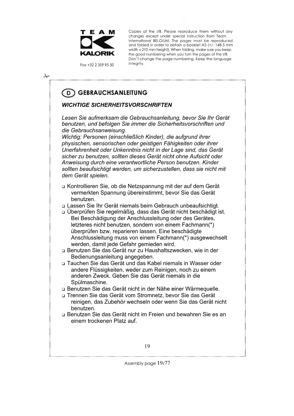 WICHTIGE SICHERHEITSVORSCHRIFTEN Lesen Sie aufmerksam die Gebrauchsanleitung, bevor Sie Ihr Gerät benutzen, und befolgen Sie immer die Sicherheitsvorschriften und die Gebrauchsanweisung. Wichtig: Personen (einschließlich Kinder), die aufgrund ihrer physischen, sensorischen oder geistigen Fähigkeiten oder ihrer Unerfahrenheit oder Unkenntnis nicht in der Lage sind, das Gerät sicher zu benutzen, sollten dieses Gerät nicht ohne Aufsicht oder Anweisung durch eine verantwortliche Person benutzen. Kinder sollten beaufsichtigt werden, um sicherzustellen, dass sie nicht mit dem Gerät spielen. q Kontrollieren Sie, ob die Netzspannung mit der auf dem Gerät vermerkten Spannung übereinstimmt, bevor Sie das Gerät benutzen. q Lassen Sie Ihr Gerät niemals beim Gebrauch unbeaufsichtigt. q Überprüfen Sie regelmäßig, dass das Gerät nicht beschädigt ist. Bei Beschädigung der Anschlussleitung oder des Gerätes, letzteres nicht benutzen, sondern von einem Fachmann(*) überprüfen bzw. reparieren lassen. Eine beschädigte Anschlussleitung muss von einem Fachmann(*) ausgewechselt werden, damit jede Gefahr gemieden wird. q Benutzen Sie das Gerät nur zu Haushaltszwecken, wie in der Bedienungsanleitung angegeben. q Tauchen Sie das Gerät und das Kabel niemals in Wasser oder andere Flüssigkeiten, weder zum Reinigen, noch zu einem anderen Zweck. Geben Sie das Gerät niemals in die Spülmaschine. q Benutzen Sie das Gerät nicht in der Nähe einer Wärmequelle. q Trennen Sie das Gerät vom Stromnetz, bevor Sie das Gerät reinigen, das Zubehör wechseln oder wenn Sie das Gerät nicht benutzen. q Benutzen Sie das Gerät nicht im Freien und bewahren Sie es an einem trockenen Platz auf.Fax +32 2 359 95 50 Copies of the I/B. Please reproduce them without any changes except under special instruction from Team International BELGIUM. The pages must be reproduced and folded in order to obtain a booklet A5 (+/- 148.5 mm width x 210 mm height). When folding, make sure you keep the good numbering when you turn the pages of the I/B. Don’t change the page numbering. Keep the language integrity.