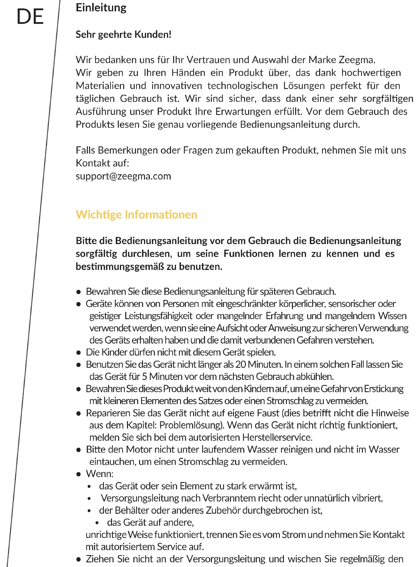 - Beim Pressen von Sa aus hartem Gemüse und Früchten (z.B. Karoe) ist Vorsicht geboten. Das Gerät kann sich schneller überhitzen. Problemlösung Problem Bie prüfen Lösung Slow Juicer funkoniert nicht Ist die Versorgungsleitung angeschlossen? Bie prüfen, ob die Versorgungsleitung an Steckdose mit einer Leistung von 220-240 V ~ 50-60 Hz angeschlossen wird. Ist Slow Juicer richg monert? Moneren Sie das Gerät laut der Bedienungsanleitung. Ist der Einschalter richg eingestellt? Um das Gerät einzuschalten, schieben Sie den Knopf auf „STA”. Haben Sie das Gerät länger als 20 Minuten benutzt? Schalten Sie das Gerät aus. Warten Sie kurz und schalten Sie es wieder ein. Wenn das Gerät noch 20 Minuten benutzen möchten, braucht das Produkt eine Stunde, um sich richg abzukühlen.DE Problem Bie prüfen Lösung Der Sa enthält Elemente des Fleisches oder Sa läu von dem Auslauf für Fleisch aus Ist das Gummivenl richg monert? Setzen Sie das Venl auf oder korrigieren Sie das Venl laut der in Bedienungsanleitung beschriebenen Hinweise. Haben Sie frische Obst oder Gemüse verwendet? Überreife Früchte und Gemüse enthalten weniger Wasser und können den Mechanismus verstopfen, zuerst weichen Sie diese im Mineralwasser für mindestens 10 Minuten ein. Haben Sie in Slow Juicer zu viele Produkte auf einmal eingelegt? Stellen Sie den Einschalter auf Reverse-Modus (REV) ein, nach einigen Sekunden stoppen Sie das Gerät und stellen Sie es auf Normal-Modus (STA) ein. Slow Juicer stoppt während der Arbeit Haben Sie in Slow Juicer die Früchte/Gemüse „mit Kra” eingelegt? Enernen Sie einen Teil der Früchte oder Gemüse. Haben Sie in Slow Juicer die Früchte/Gemüse mit harten Steinen eingelegt? Stellen Sie den Umschalter auf dem Modus des Rückwärtsgangs (REV) ein, nach einigen Sekunden stoppen Sie das Gerät und stellen Sie es auf Normal- Modus (STA) ein. Fleisch ist zu nass Ist das Sieb verstop? Prüfen Sie, ob sich im Mechanismus der Schnecke nicht zu viel Fleisch bendet. Reinigen Sie ihn. Der Motor arbeitet zu laut oder vibriert Haben Sie alle Elemente des Satzes richg monert? Wenn das Produkt richg monert ist: es ist ganz normal, dass das Gerät lauter beim Pressen von Sa aus überreifen Früchten und Gemüsen. Der Behälter vibriert während der Arbeit Das ist eine normale Arbeit des Produkts. Der Motor treibt den Behälter an.DE Reinigung und Instandhaltung Benutzen Sie keine Reinigungsmi el wie Lösungsmi el, Verdünner, Bleichmi el oder andere Mi el, die Chlor oder Benzen enthalten. Benutzen Sie auch keine Schleifmi el. Vor der Reinigung bi e das Gerät ausschalten. Reinigung der Basis mit Motor: Bi e ein weiches, feuchtes Tuch benutzen. Bi e die Basis des Entsa ers in Wasser eintauchen oder unter laufendem Wasser nicht reinigen. Zur Reinigung des Kabels und des Steckers bi e ein trockenes Tuch benutzen. Reinigung der Drehschnecken: Bi e eine Bürste oder ein nasses Tuch zur Reinigung der Resten vom Fleisch benutzen. Die Drehschnecke kann man unter ießendem Wasser reinigen. Bi e das Produkt nach jedem Gebrauch reinigen. Reinigung weiterer Elemente des Satzes: Bi e keine Spülmaschine benutzen. Bi e die Elemente nicht z.B. mit einem Trockner trocknen. Nach jedem Gebrauch bi e das Produkt reinigen. Das Fleisch soll maximal 5 Minuten nach der Beendigung des Pressens. Das Produkt s mmt mit den Richtlinien der Europäischen Union. Gemäß der Richtlinie 2012/19/ UE unterliegt das Produkt einer getrennten Sammlung. Das Produkt darf man nicht zusammen mit kommunalen Abfällen entsorgen, weil das die Gefahr für die Umwelt und die Gesundheit der Menschen bilden kann. Das verbrauchte Produkt soll man in einem entsprechenden Rücknahmepunkt für Elektro- und Elektronik-Altgeräte zurückgeben. Die Fotos sind anschaulich, das tatsächliche Aussehen der Produkte kann von der gezeigten Abbildung abweichen.PL Wprowadzenie Drogi Kliencie! Dziękujemy za obdarzenie nas zaufaniem i wybranie marki Zeegma. Oddajemy w Twoje ręce produkt idealny do codziennego użytkowania dzięki wykorzystaniu wysokiej jakości materiałów i nowoczesnych rozwiązań technicznych. Jesteśmy pewni, że ogromna staranność wykonania sprawi, że spełni on Twoje wymagania. Przed użyciem produktu zapoznaj się dokładnie z poniższą instrukcją obsługi. Jeśli masz jakiekolwiek uwagi lub pytania do zakupionego produktu, skontaktuj się z nami: support@zeegma.com Ważne informacje Prosimy o przeczytanie tej instrukcji przed przystąpieniem do obsługi urządzenia, aby zapoznać się z jego funkcjami i wykorzystać je zgodnie z przeznaczeniem.