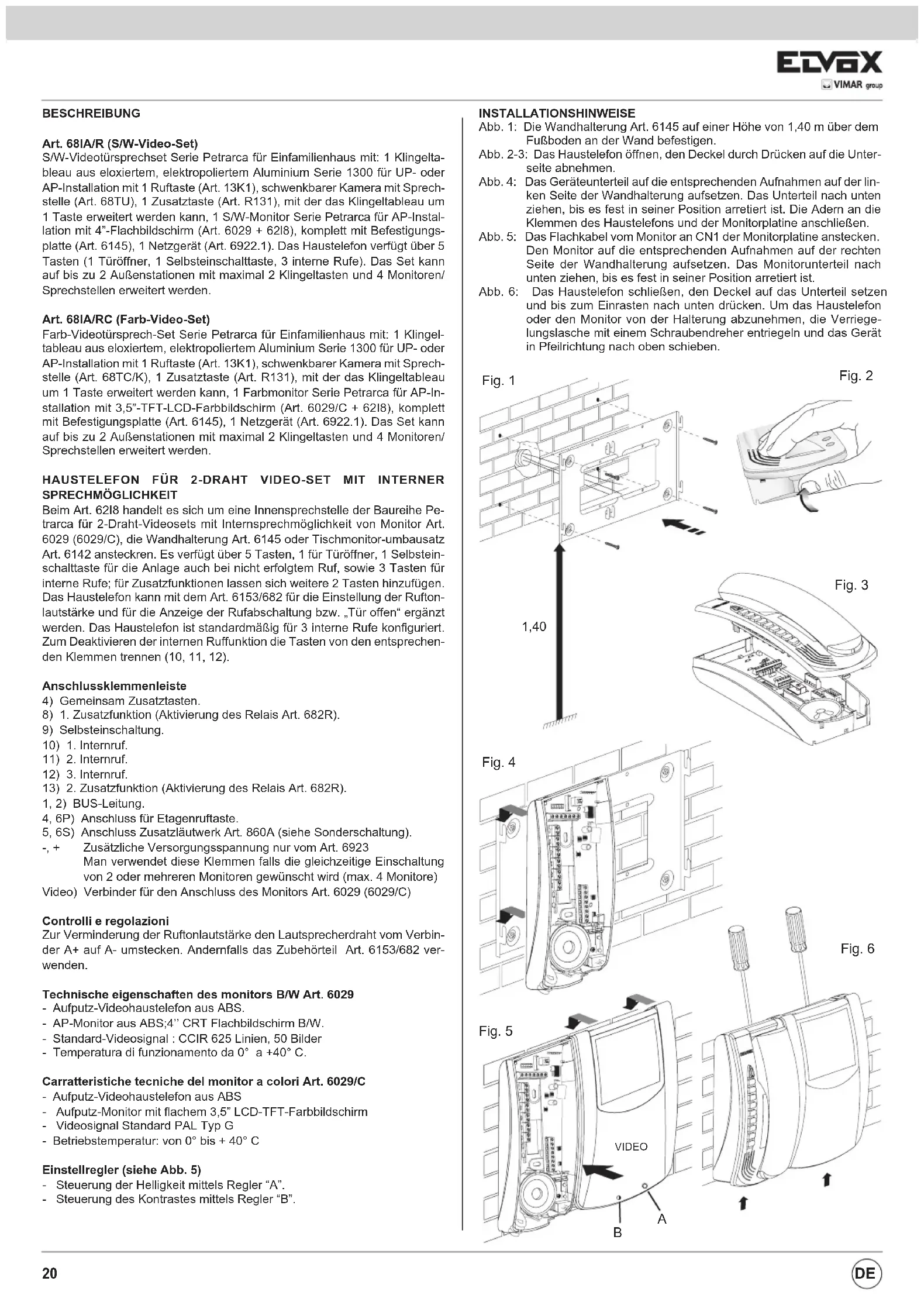 1, 2) BUS-Leitung. 4, 6P) Anschluss für Etagenruftaste. 5, 6S) Anschluss Zusatzläutwerk Art. 860A (siehe Sonderschaltung). -, + Zusätzliche Versorgungsspannung nur vom Art. 6923 Man verwendet diese Klemmen falls die gleichzeitige Einschaltung von 2 oder mehreren Monitoren gewünscht wird (max. 4 Monitore) Video) Verbinder für den Anschluss des Monitors Art. 6029 (6029/C) Controlli e regolazioni Zur Verminderung der Ruftonlautstärke den Lautsprecherdraht vom Verbin- der A+ auf A- umstecken. Andernfalls das Zubehörteil Art. 6153/682 ver- wenden. Technische eigenschaften des monitors B/W Art. 6029 - Aufputz-Videohaustelefon aus ABS. - AP-Monitor aus ABS;4’’ CRT Flachbildschirm B/W. - Standard-Videosignal : CCIR 625 Linien, 50 Bilder - Temperatura di funzionamento da 0° a +40° C. Carratteristiche tecniche del monitor a colori Art. 6029/C - Aufputz-Videohaustelefon aus ABS - Aufputz-Monitor mit flachem 3,5” LCD-TFT-Farbbildschirm - Videosignal Standard PAL Typ G - Betriebstemperatur: von 0° bis + 40° C Einstellregler (siehe Abb. 5) - Steuerung der Helligkeit mittels Regler “A”. - Steuerung des Kontrastes mittels Regler “B”. INSTALLATIONSHINWEISE Abb. 1: Die Wandhalterung Art. 6145 auf einer Höhe von 1,40 m über dem Fußboden an der Wand befestigen. Abb. 2-3: Das Haustelefon öffnen, den Deckel durch Drücken auf die Unter- seite abnehmen. Abb. 4: Das Geräteunterteil auf die entsprechenden Aufnahmen auf der lin- ken Seite der Wandhalterung aufsetzen. Das Unterteil nach unten ziehen, bis es fest in seiner Position arretiert ist. Die Adern an die Klemmen des Haustelefons und der Monitorplatine anschließen. Abb. 5: Das Flachkabel vom Monitor an CN1 der Monitorplatine anstecken. Den Monitor auf die entsprechenden Aufnahmen auf der rechten Seite der Wandhalterung aufsetzen. Das Monitorunterteil nach unten ziehen, bis es fest in seiner Position arretiert ist. Abb. 6: Das Haustelefon schließen, den Deckel auf das Unterteil setzen und bis zum Einrasten nach unten drücken. Um das Haustelefon oder den Monitor von der Halterung abzunehmen, die Verriege- lungslasche mit einem Schraubendreher entriegeln und das Gerät in Pfeilrichtung nach oben schieben. 1,40 Fig. 1 Fig. 6 Fig. 4 Fig. 5 VIDEO