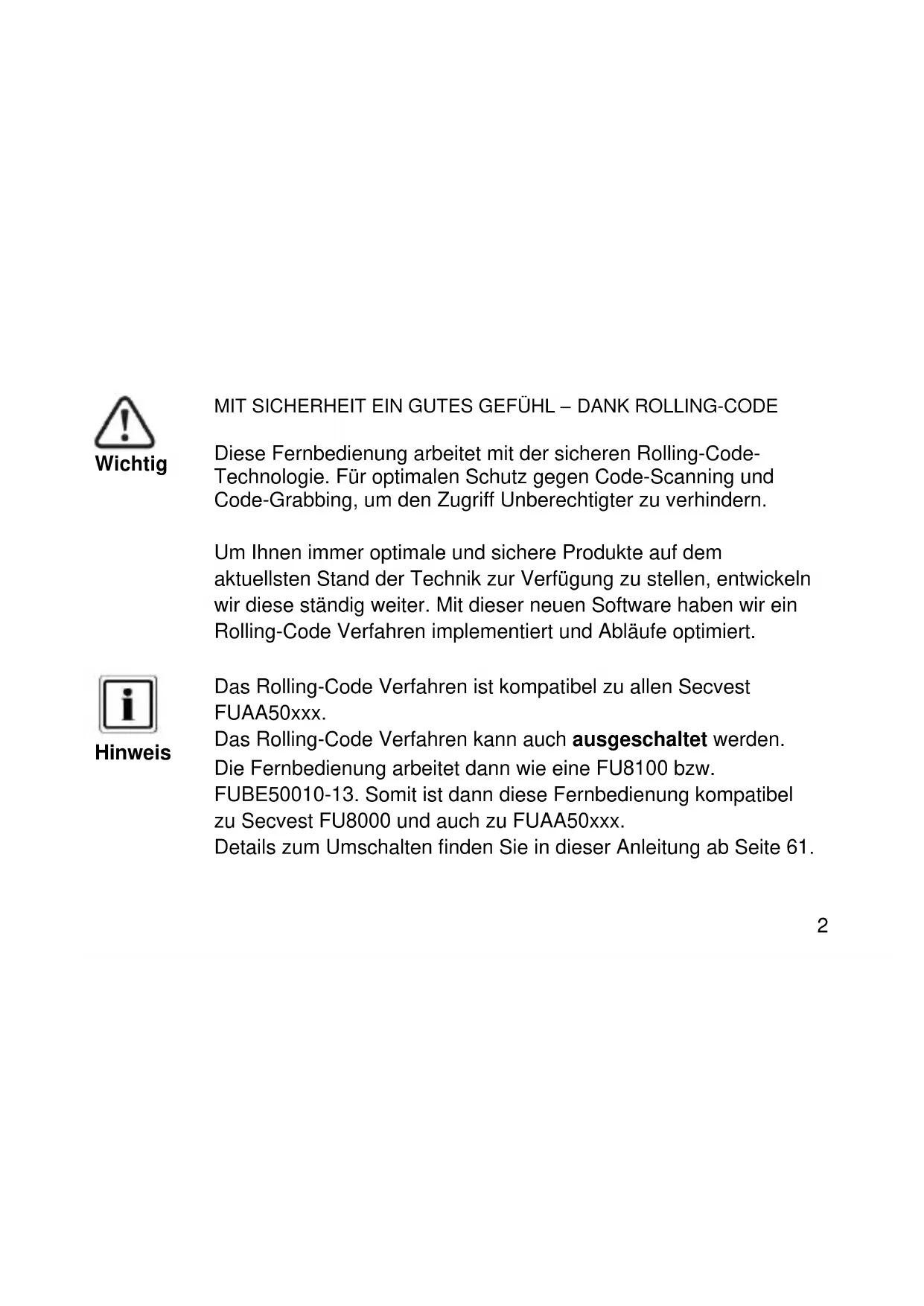 Wichtig MIT SICHERHEIT EIN GUTES GEFÜHL – DANK ROLLING-CODE Diese Fernbedienung arbeitet mit der sicheren Rolling-Code- Technologie. Für optimalen Schutz gegen Code-Scanning und Code-Grabbing, um den Zugriff Unberechtigter zu verhindern. Um Ihnen immer optimale und sichere Produkte auf dem aktuellsten Stand der Technik zur Verfügung zu stellen, entwickeln wir diese ständig weiter. Mit dieser neuen Software haben wir ein Rolling-Code Verfahren implementiert und Abläufe optimiert.