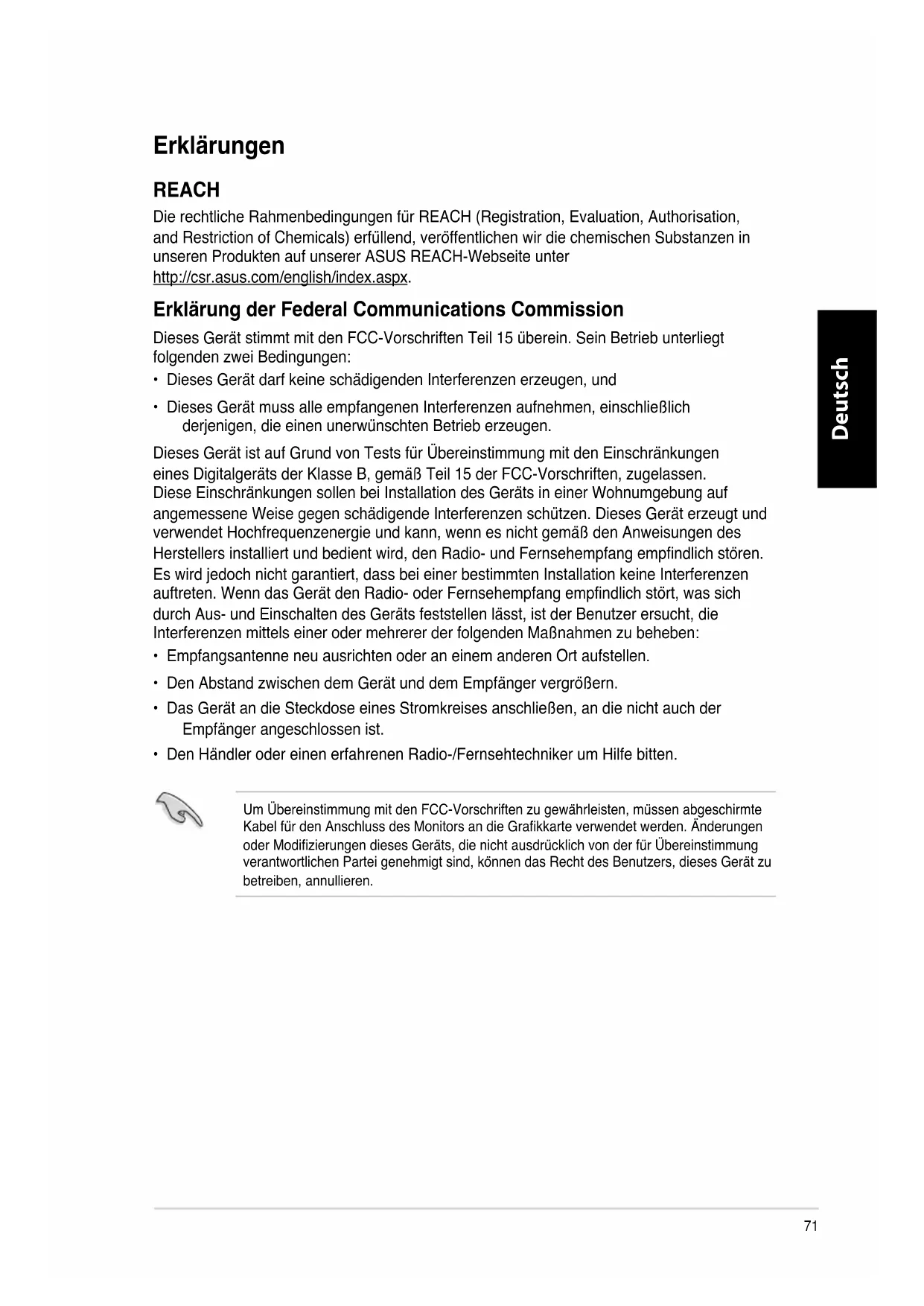 - Den Händler oder einen erfahrenen Radio-/Fernsehtechniker um Hilfe bitten. Um Übereinstimmung mit den FCC-Vorschriften zu gewährleisten, müssen abgeschirmte Kabel für den Anschluss des Monitors an die Grakkarte verwendet werden. Änderungen oder Modizierungen dieses Geräts, die nicht ausdrücklich von der für Übereinstimmung verantwortlichen Partei genehmigt sind, können das Recht des Benutzers, dieses Gerät zu betreiben, annullieren.72 Deutsch Deutsch Deutsch Deutsch Rücknahmeservices Das ASUS-Wiederverwertungs- und Rücknahmeprogramm basiert auf den Bestrebungen, die höchsten Standards zum Schutz der Umwelt anzuwenden. Wir glauben, das die Bereitstellung einer Lösung für unsere Kunden die Möglichkeit schafft, unsere Produkte, Batterien, andere Komponenten und ebenfalls das Verpackungsmaterial verantwortungsbewußt der Wiederverwertung zuzuführen. Besuchen Sie bitte die Webseite unter http://csr.asus.com/english/Takeback.htm für Details zur Wiederverwertung in verschiedenen Regionen. RF-Aussetzungswarnung Dieses Gerät und die integrierte Antenne dürfen nicht näher als 20 cm an Ihrem Körper oder in der Nähe bendenden Personen installiert und betrieben werden. Dieses Gerät und seine Antenne(n) dürfen nicht zusammen oder in der Nähe mit anderen Antennen oder Sendern betrieben werden. Endnutzer müssen die spezischen Betriebsanleitungen für eine RF- Aussetzung innerhalb der anerkannten Bereiche befolgen. Erklärung.des.kanadischen.Ministeriums.für.Telekommunikation Dieses Digitalgerät überschreitet keine Grenzwerte für Funkrauschemissionen der Klasse B, die vom kanadischen Ministeriums für Telekommunikation in den Funkstörvorschriften festgelegt sind. Dieses Digitalgerät der Klasse B stimmt mit dem kanadischen ICES-003 überein. Macrovision.Corporation-Produktanmerkung Dieses Produkt verfügt über Kopierschutztechnologie, die durch methodische Anforderungen bestimmter U.S.A.-Patente und anderer geistiger Eigentumsrechte der Macrovision Corporation und anderer Parteien geschützt sind. Die Verwendung dieser Kopierschutztechnologie muss von Macrovision Corporation genehmigt werden und ist, wenn.nicht.anderweitig.von.der.Macrovision.Corporation.genehmigt, nur für private oder eingeschränkte Vorführungszwecke vorgesehen. Reverse-Engineering oder Demontage ist verboten. Warnung:.Lithium-Ionen-Akkus