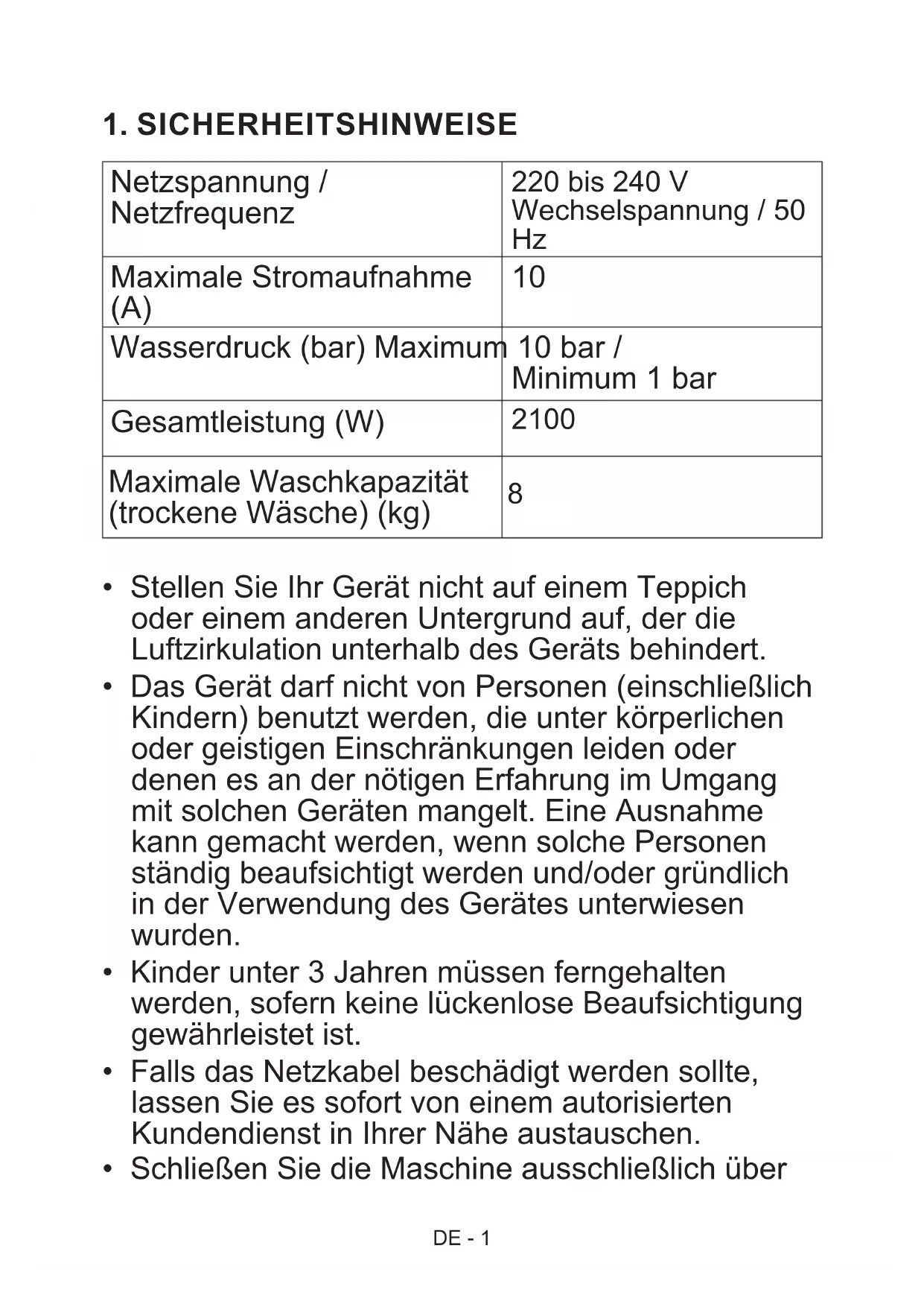- Die Verpackung des Gerätes könnte für Kinder gefährlich werden. Erlauben Sie Kindern nicht, DE - 3mit der Verpackung oder mit Kleinteilen aus der Waschmaschine zu spielen.