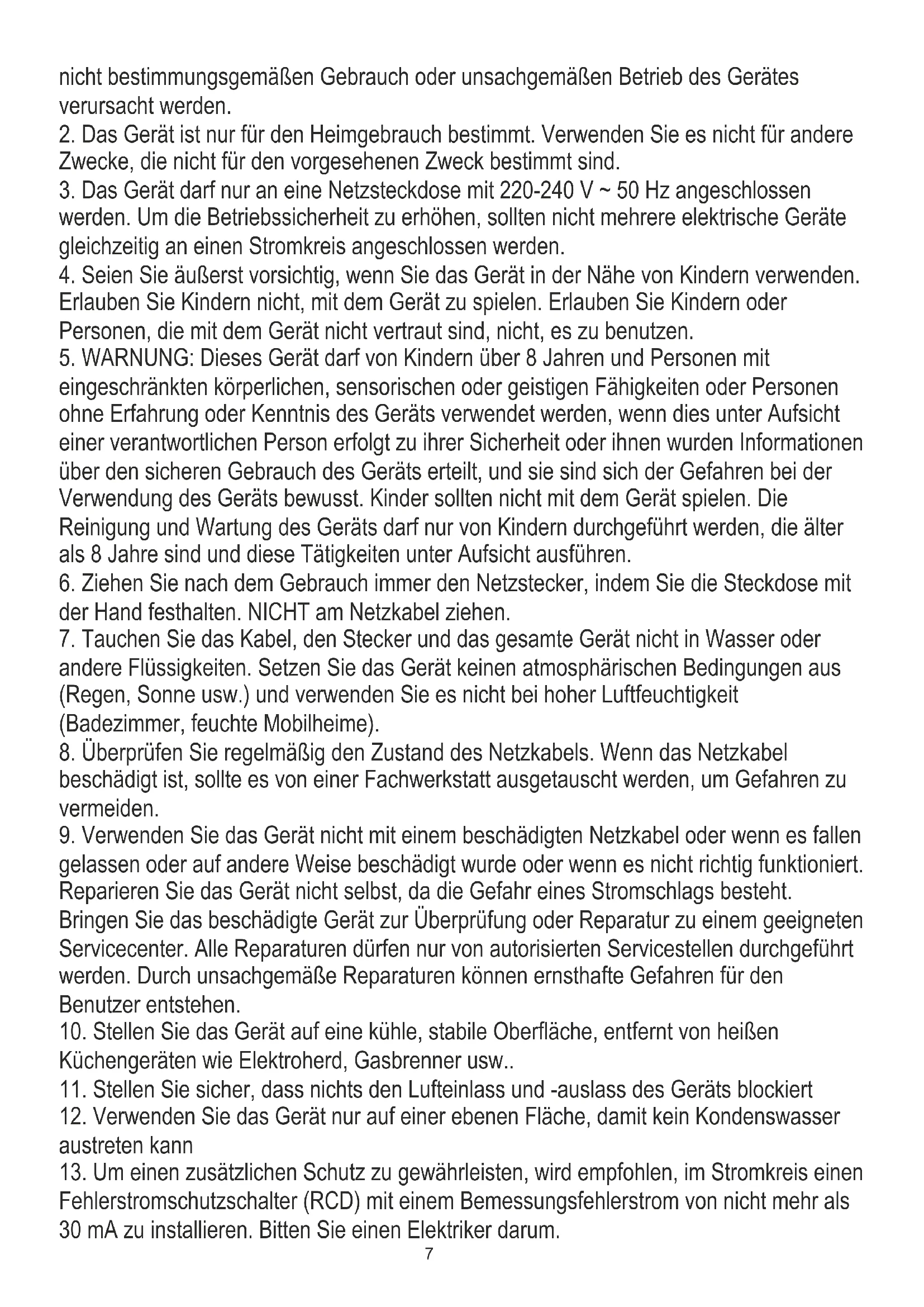 eingeschränkten körperlichen, sensorischen oder geistigen Fähigkeiten oder Personen ohne Erfahrung oder Kenntnis des Geräts verwendet werden, wenn dies unter Aufsicht einer verantwortlichen Person erfolgt zu ihrer Sicherheit oder ihnen wurden Informationen über den sicheren Gebrauch des Geräts erteilt, und sie sind sich der Gefahren bei der Verwendung des Geräts bewusst. Kinder sollten nicht mit dem Gerät spielen. Die Reinigung und Wartung des Geräts darf nur von Kindern durchgeführt werden, die älter als 8 Jahre sind und diese Tätigkeiten unter Aufsicht ausführen.