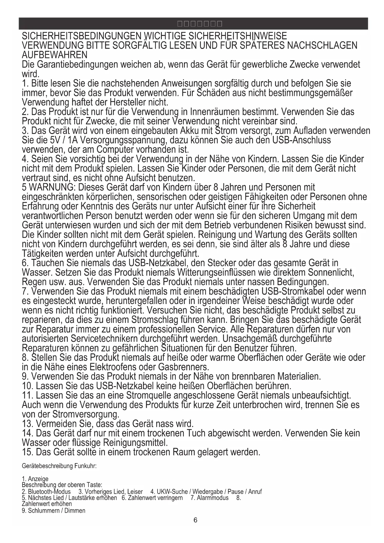 ANMERKUNGEN: Wenn der Wecker klingelt, verwenden Sie eine beliebige Taste, um in den Schlummermodus zu gelangen. Nach 2 Minuten ertönt der Wecker erneut. Drücken Sie im Schlummermodus zweimal die Taste Snooze / Dimming (9). Der Wecker klingelt am selben Tag nicht noch einmal. Wenn der Wecker klingelt und Sie keine Taste drücken, stoppt er nach 1 Minute und beginnt nach 2 weiteren Minuten erneut. Das wird 3 mal passieren. Danach klingelt der Wecker am gleichen Tag nicht mehr. Fehlerbehebung: Problem: Das Gerät kann keine Bluetooth-Verbindung herstellen. Lösung: 1.Überprüfen Sie, ob das Produkt nicht mit einem anderen Gerät verbunden ist. Trennen Sie das aktuelle Gerät und schließen Sie das neue wieder an.