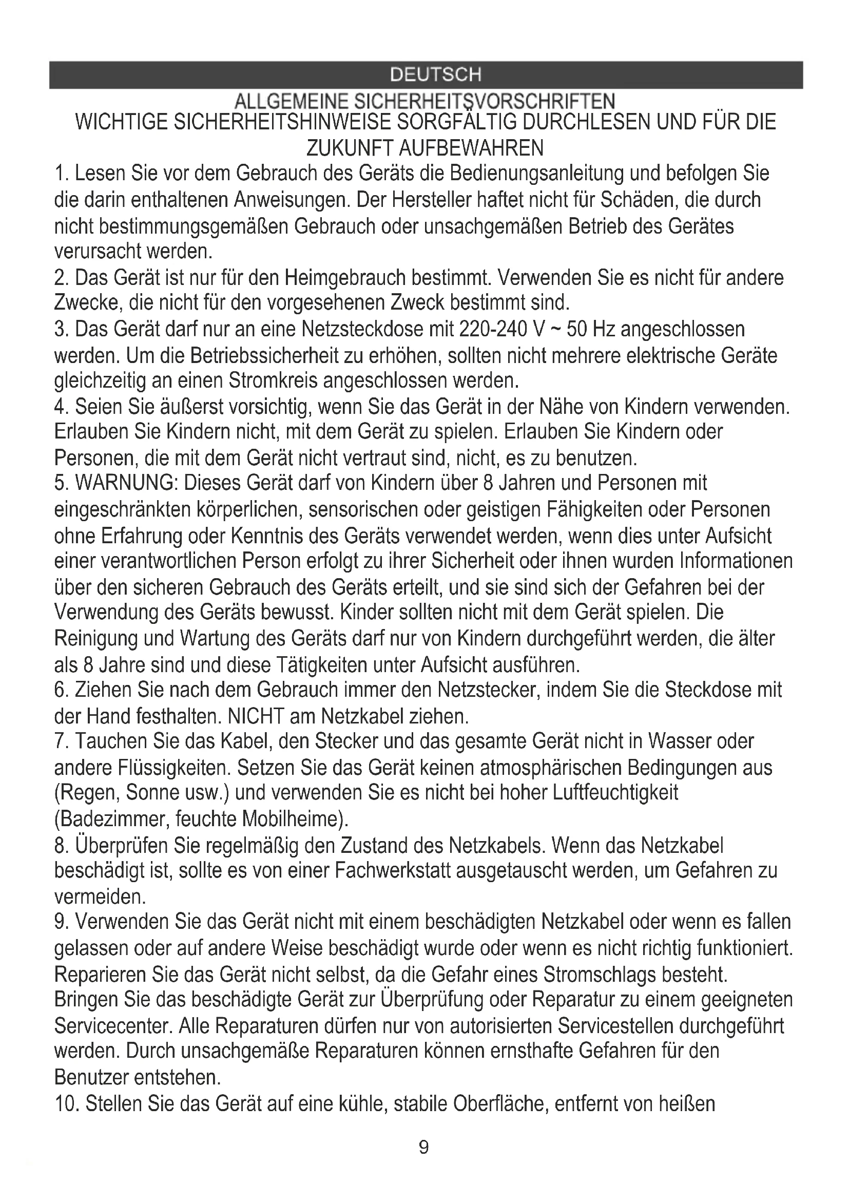 3. Das Gerät darf nur an eine Netzsteckdose mit 220-240 V ~ 50 Hz angeschlossen