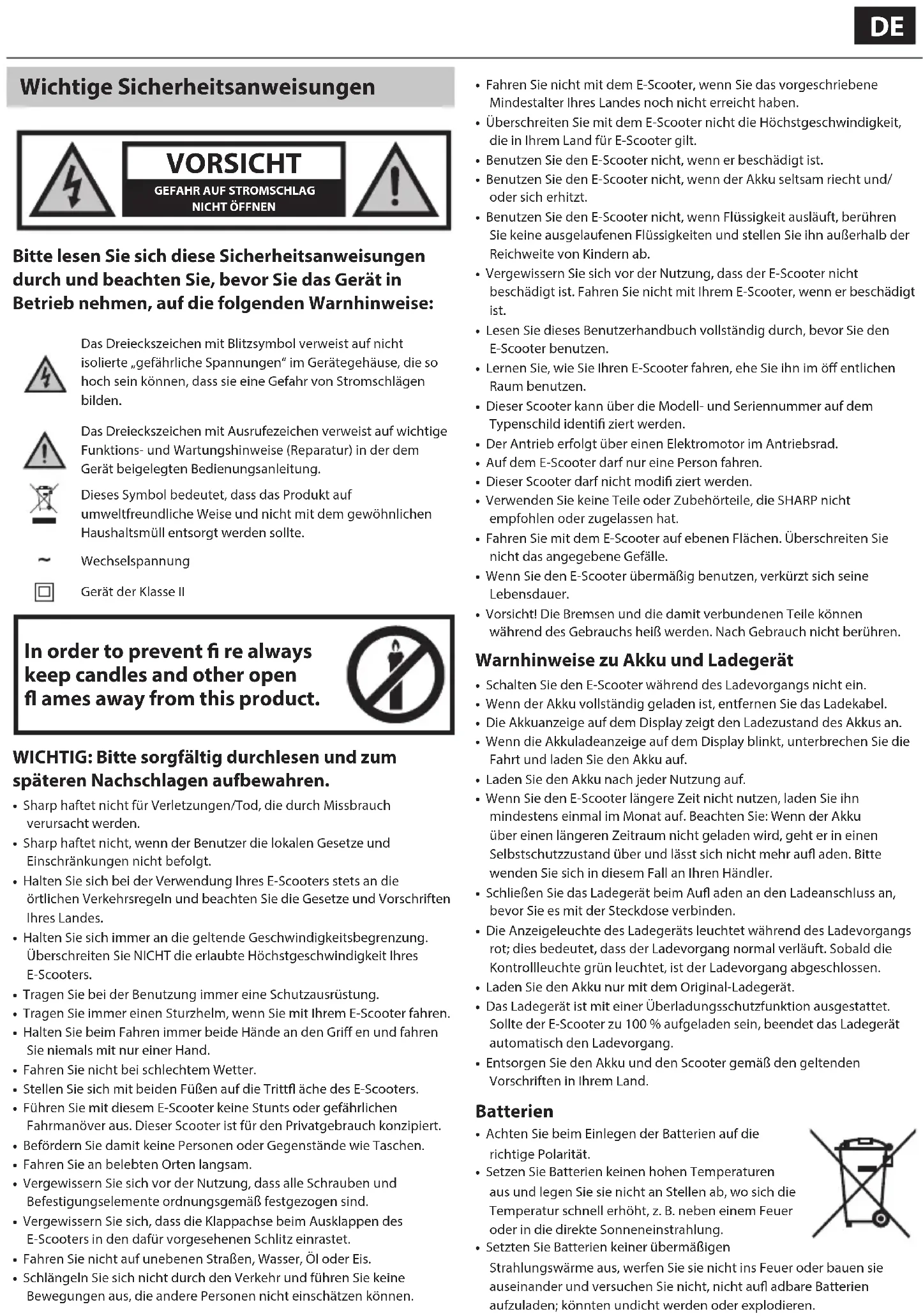 - Lesen Sie dieses Benutzerhandbuch vollständig durch, bevor Sie den E-Scooter benutzen.• Lernen Sie, wie Sie Ihren E-Scooter fahren, ehe Sie ihn im ö entlichen Raum benutzen.• Dieser Scooter kann über die Modell- und Seriennummer auf dem Typenschild identi ziert werden.• Der Antrieb erfolgt über einen Elektromotor im Antriebsrad.• Auf dem E-Scooter darf nur eine Person fahren.• Dieser Scooter darf nicht modi ziert werden.• Verwenden Sie keine Teile oder Zubehörteile, die SHARP nicht empfohlen oder zugelassen hat.• Fahren Sie mit dem E-Scooter auf ebenen Flächen. Überschreiten Sie nicht das angegebene Gefälle.• Wenn Sie den E-Scooter übermäßig benutzen, verkürzt sich seine Lebensdauer.• Vorsicht! Die Bremsen und die damit verbundenen Teile können während des Gebrauchs heiß werden. Nach Gebrauch nicht berühren. Warnhinweise zu Akku und Ladegerät