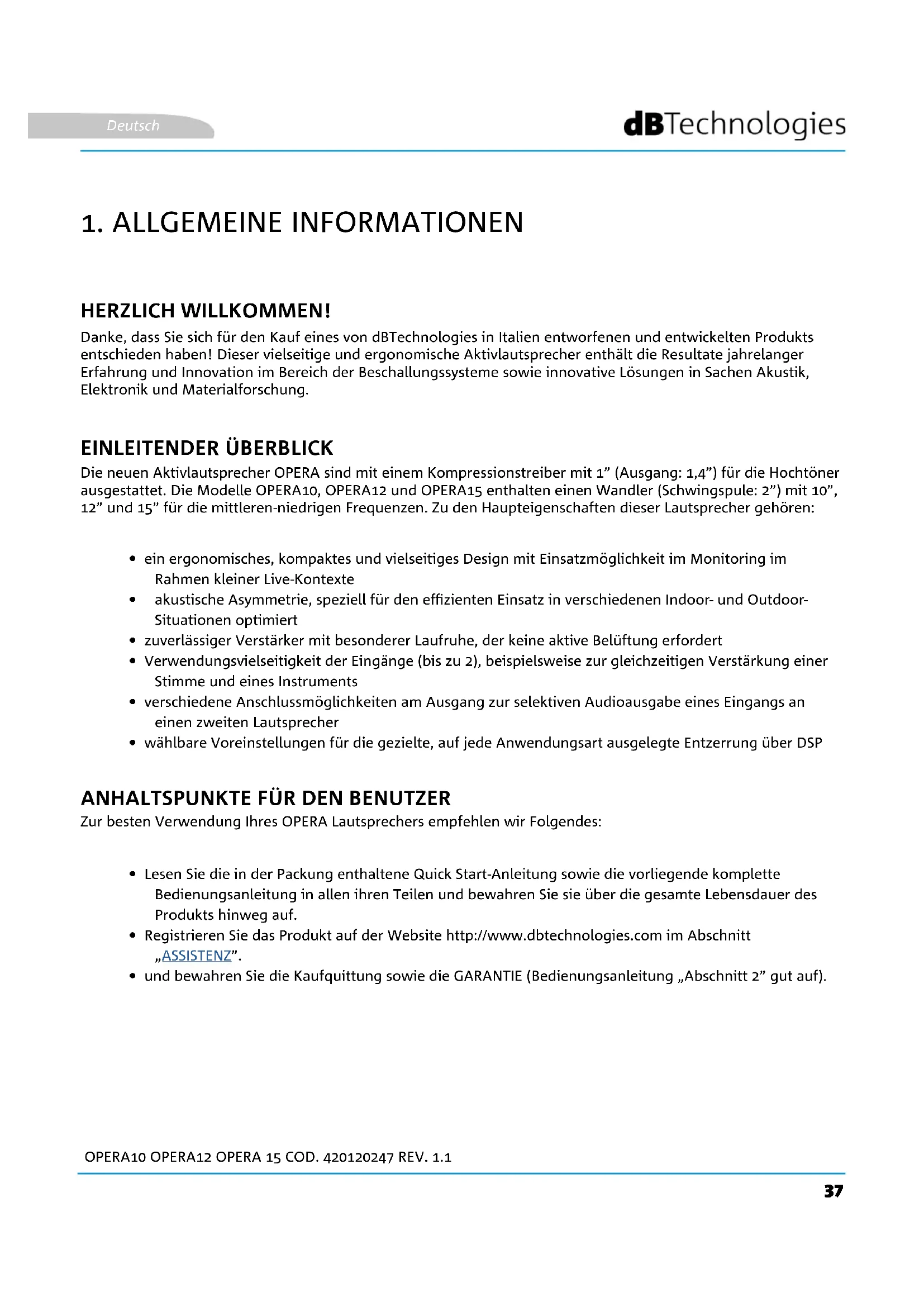 Danke, dass Sie sich für den Kauf eines von dBTechnologies in Italien entworfenen und entwickelten Produkts entschieden haben! Dieser vielseitige und ergonomische Aktivlautsprecher enthält die Resultate jahrelanger Erfahrung und Innovation im Bereich der Beschallungssysteme sowie innovative Lösungen in Sachen Akustik, Elektronik und Materialforschung. Die neuen Aktivlautsprecher OPERA sind mit einem Kompressionstreiber mit 1” (Ausgang: 1,4”) für die Hochtöner ausgestattet. Die Modelle OPERA10, OPERA12 und OPERA15 enthalten einen Wandler (Schwingspule: 2”) mit 10”, 12” und 15” für die mittleren-niedrigen Frequenzen. Zu den Haupteigenschaften dieser Lautsprecher gehören: Zur besten Verwendung Ihres OPERA Lautsprechers empfehlen wir Folgendes: