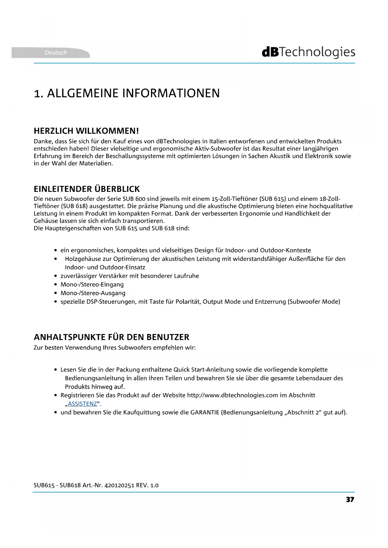 SUB 615 - SUB618 Art.-Nr. 420120251 REV. 1.0 INHALTSVERZEICHNIS Deutsch37 SUB615 - SUB618 Art.-Nr. 420120251 REV. 1.0