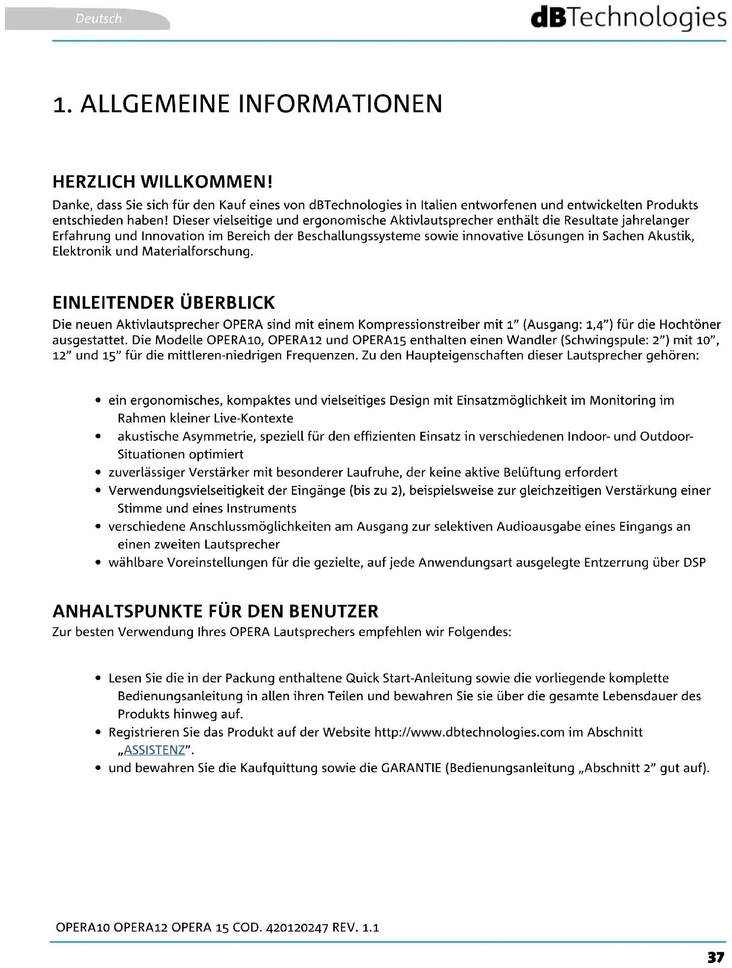 Danke, dass Sie sich für den Kauf eines von dBTechnologies in Italien entworfenen und entwickelten Produkts entschieden haben! Dieser vielseitige und ergonomische Aktivlautsprecher enthält die Resultate jahrelanger Erfahrung und Innovation im Bereich der Beschallungssysteme sowie innovative Lösungen in Sachen Akustik, Elektronik und Materialforschung. Die neuen Aktivlautsprecher OPERA sind mit einem Kompressionstreiber mit 1” (Ausgang: 1,4”) für die Hochtöner ausgestattet. Die Modelle OPERA10, OPERA12 und OPERA15 enthalten einen Wandler (Schwingspule: 2”) mit 10”, 12” und 15” für die mittleren-niedrigen Frequenzen. Zu den Haupteigenschaften dieser Lautsprecher gehören: Zur besten Verwendung Ihres OPERA Lautsprechers empfehlen wir Folgendes: