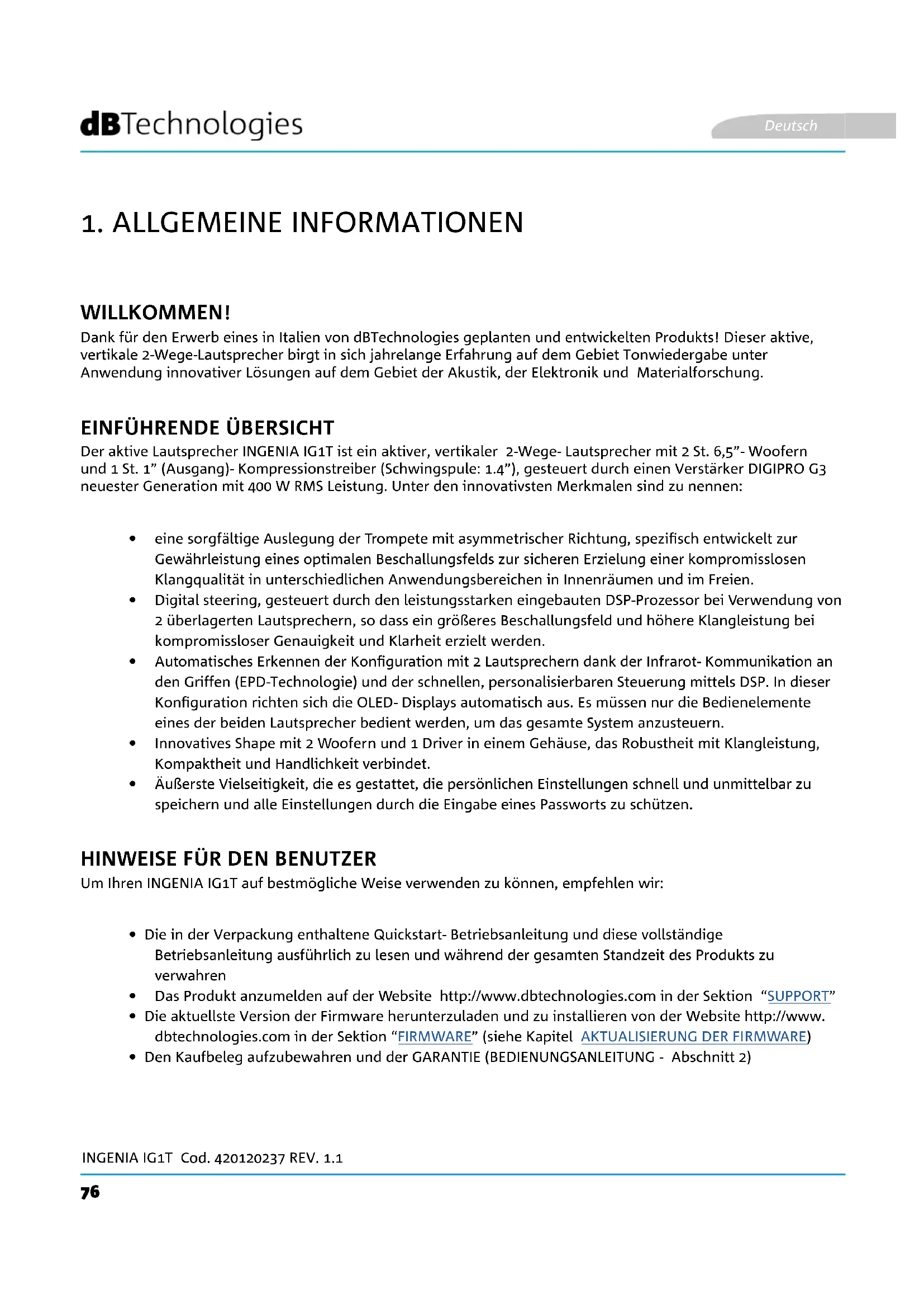 Deutsch Anlaufüberstroms: 18,64 A107 INGENIA IG1T Cod. 420120237 REV. 1.1 Breite: Griffe: Tiefe: Höhe: Montage auf Stange: Gewicht: 195 mm 1 oben / 1 unten mit IR-Schnittstelle 271 mm 536 mm Ja, 36 mm 10,8 kg Deutsch108 INGENIA IG1T Cod. 420120237 REV. 1.1 Eigenschaften, Spezikationen und Aussehen der Produkte können ohne Ankündigung geändert werden. dBTechnologies behält sich das Recht vor, Änderungen oder Verbesserungen der Eigenschaften oder Herstellung des Produkts vorzunehmen, ohne verpichtet zu sein, die vorher hergestellten Produkte auf den gleichen Stand zu bringen. A.E.B. Industriale Srl Via Brodolini, 8 Località Crespellano 40053 VALSAMOGGIA BOLOGNA (ITALIA) Tel +39 051 969870 Fax +39 051 969725 www.dbtechnologies.com info@dbtechnologies-aeb.com Deutsch109 INGENIA IG1T Cod. 420120237 REV. 1.1 RÉSUMÉ 1. INFORMATIONS GÉNÉRALES ..............................................................................................111 BIENVENUE ! .....................................................................................................................111