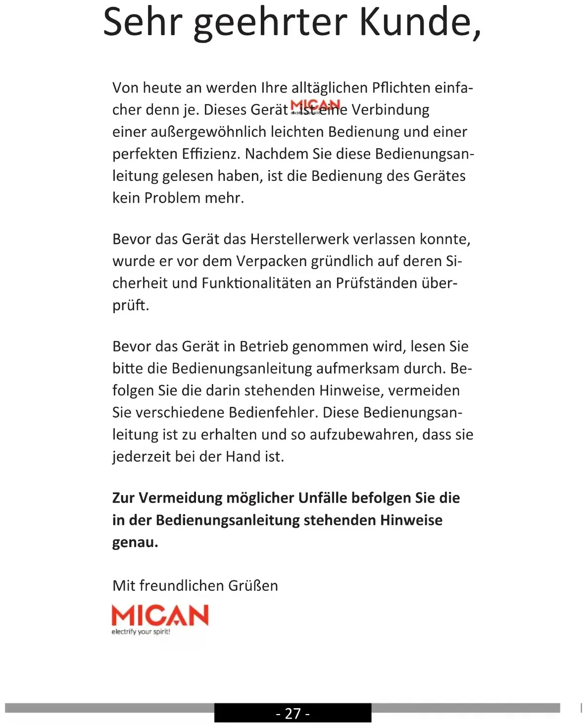 - ErP Directive 2009/125/EC / The Ecodesign for Energy-related Products Regula- tions 2010 (as amended) for the applicable implementing measures which apply in Great Britain and Northern Ireland, respectively. and therefore the product has been marked with and symbols and the Decla- ration of Conformity, the Manufacturer has drawn up the declaration and is available to the competent authorities regulating the market.- 27 - Sehr geehrter Kunde, Von heute an werden Ihre alltäglichen Pichten einfa- cher denn je. Dieses Gerät ist eine Verbindung einer außergewöhnlich leichten Bedienung und einer perfekten Ezienz. Nachdem Sie diese Bedienungsan- leitung gelesen haben, ist die Bedienung des Gerätes kein Problem mehr. Bevor das Gerät das Herstellerwerk verlassen konnte, wurde er vor dem Verpacken gründlich auf deren Si- cherheit und Funkonalitäten an Prüfständen über- prü. Bevor das Gerät in Betrieb genommen wird, lesen Sie bie die Bedienungsanleitung aufmerksam durch. Be- folgen Sie die darin stehenden Hinweise, vermeiden Sie verschiedene Bedienfehler. Diese Bedienungsan- leitung ist zu erhalten und so aufzubewahren, dass sie jederzeit bei der Hand ist. Zur Vermeidung möglicher Unfälle befolgen Sie die in der Bedienungsanleitung stehenden Hinweise genau. Mit freundlichen Grüßen- 28 - SICHERHEITSHINWEISE