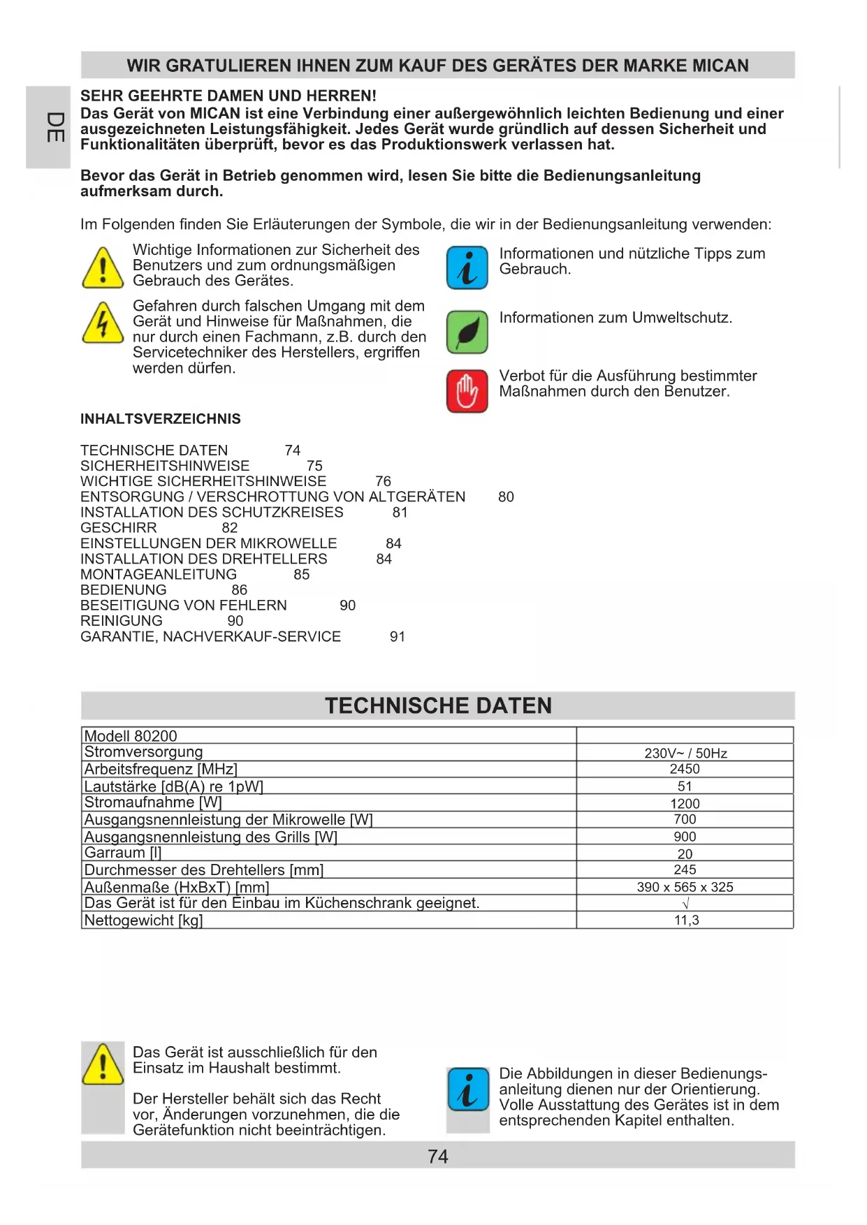 Die Abbildungen in dieser Bedienungs-anleitung dienen nur der Orientierung. Volle Ausstattung des Gerätes ist in dem entsprechenden Kapitel enthalten.Modell 80200Stromversorgung230V~ / 50HzArbeitsfrequenz [MHz] Lautstärke [dB(A) re 1pW] Stromaufnahme [W] Ausgangsnennleistung der Mikrowelle [W] Ausgangsnennleistung des Grills [W] Garraum [l] Durchmesser des Drehtellers [mm] Außenmaße (HxBxT) [mm]390 x 565 x 325Das Gerät ist für den Einbau im Küchenschrank geeignet. Nettogewicht [kg] 11,3 TECHNISCHE DATEN INHALTSVERZEICHNISTECHNISCHE DATEN 74SICHERHEITSHINWEISE 75WICHTIGE SICHERHEITSHINWEISE 76ENTSORGUNG / VERSCHROTTUNG VON ALTGERÄTEN 80INSTALLATION DES SCHUTZKREISES 81GESCHIRR 82EINSTELLUNGEN DER MIKROWELLE 84INSTALLATION DES DREHTELLERS 84MONTAGEANLEITUNG 85BEDIENUNG 86BESEITIGUNG VON FEHLERN 90REINIGUNG 90GARANTIE, NACHVERKAUF-SERVICE 91 DE75 SICHERHEITSHINWEISE
