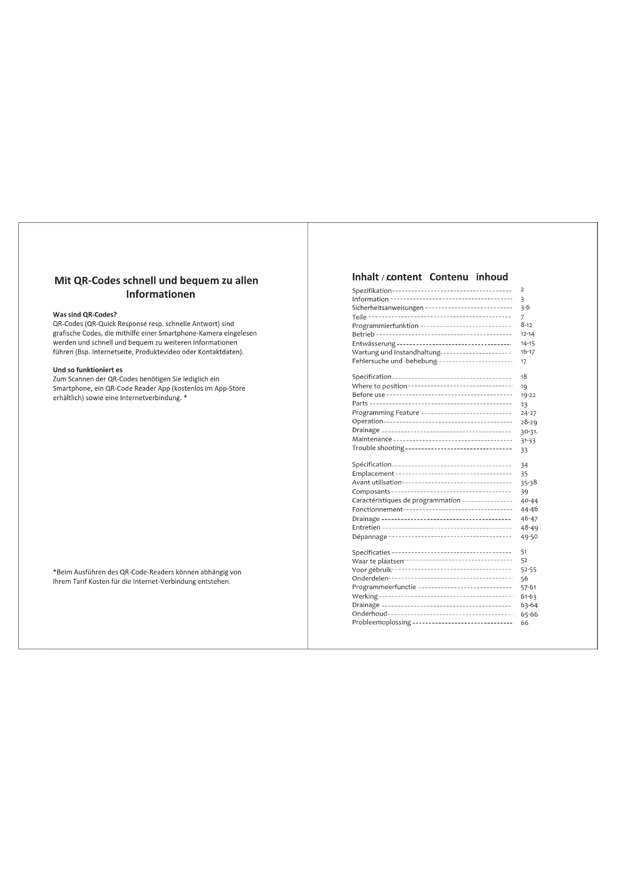 Spezifikation Information Sicherheitsanweisungen Teile Programmierfunktion Betrieb Entwässerung Wartung und Instandhaltung Fehlersuche und -behebung