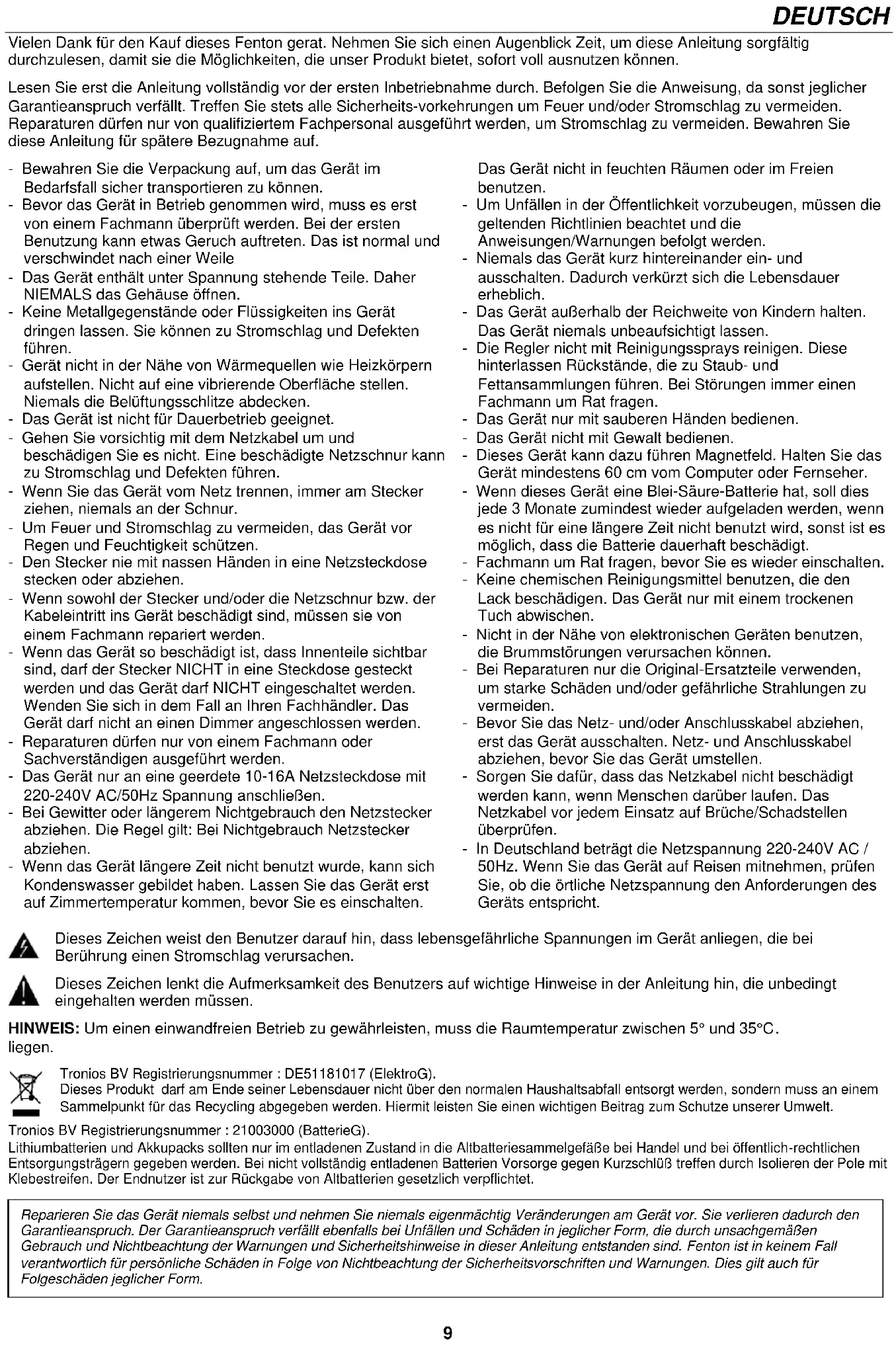 Indien er om een wachtwoord wordt gevraagd, voer "0000" in. Opmerking: De BT heeft een bereik van ongeveer 10 meter zonder enkele barrière.9 DEUTSCH Vielen Dank für den Kauf dieses Fenton gerat. Nehmen Sie sich einen Augenblick Zeit, um diese Anleitung sorgfältig durchzulesen, damit sie die Möglichkeiten, die unser Produkt bietet, sofort voll ausnutzen können. Lesen Sie erst die Anleitung vollständig vor der ersten Inbetriebnahme durch. Befolgen Sie die Anweisung, da sonst jeglicher Garantieanspruch verfällt. Treffen Sie stets alle Sicherheits-vorkehrungen um Feuer und/oder Stromschlag zu vermeiden. Reparaturen dürfen nur von qualifiziertem Fachpersonal ausgeführt werden, um Stromschlag zu vermeiden. Bewahren Sie diese Anleitung für spätere Bezugnahme auf. - Bewahren Sie die Verpackung auf, um das Gerät im Bedarfsfall sicher transportieren zu können. - Bevor das Gerät in Betrieb genommen wird, muss es erst von einem Fachmann überprüft werden. Bei der ersten Benutzung kann etwas Geruch auftreten. Das ist normal und verschwindet nach einer Weile - Das Gerät enthält unter Spannung stehende Teile. Daher NIEMALS das Gehäuse öffnen. - Keine Metallgegenstände oder Flüssigkeiten ins Gerät dringen lassen. Sie können zu Stromschlag und Defekten führen. - Gerät nicht in der Nähe von Wärmequellen wie Heizkörpern aufstellen. Nicht auf eine vibrierende Oberfläche stellen. Niemals die Belüftungsschlitze abdecken. - Das Gerät ist nicht für Dauerbetrieb geeignet. - Gehen Sie vorsichtig mit dem Netzkabel um und beschädigen Sie es nicht. Eine beschädigte Netzschnur kann zu Stromschlag und Defekten führen. - Wenn Sie das Gerät vom Netz trennen, immer am Stecker ziehen, niemals an der Schnur. - Um Feuer und Stromschlag zu vermeiden, das Gerät vor Regen und Feuchtigkeit schützen. - Den Stecker nie mit nassen Händen in eine Netzsteckdose stecken oder abziehen. - Wenn sowohl der Stecker und/oder die Netzschnur bzw. der Kabeleintritt ins Gerät beschädigt sind, müssen sie von einem Fachmann repariert werden. - Wenn das Gerät so beschädigt ist, dass Innenteile sichtbar sind, darf der Stecker NICHT in eine Steckdose gesteckt werden und das Gerät darf NICHT eingeschaltet werden. Wenden Sie sich in dem Fall an Ihren Fachhändler. Das Gerät darf nicht an einen Dimmer angeschlossen werden. - Reparaturen dürfen nur von einem Fachmann oder Sachverständigen ausgeführt werden. - Das Gerät nur an eine geerdete 10-16A Netzsteckdose mit 220-240V AC/50Hz Spannung anschließen. - Bei Gewitter oder längerem Nichtgebrauch den Netzstecker abziehen. Die Regel gilt: Bei Nichtgebrauch Netzstecker abziehen. - Wenn das Gerät längere Zeit nicht benutzt wurde, kann sich Kondenswasser gebildet haben. Lassen Sie das Gerät erst auf Zimmertemperatur kommen, bevor Sie es einschalten. Das Gerät nicht in feuchten Räumen oder im Freien benutzen. - Um Unfällen in der Öffentlichkeit vorzubeugen, müssen die geltenden Richtlinien beachtet und die Anweisungen/Warnungen befolgt werden. - Niemals das Gerät kurz hintereinander ein- und ausschalten. Dadurch verkürzt sich die Lebensdauer erheblich. - Das Gerät außerhalb der Reichweite von Kindern halten. Das Gerät niemals unbeaufsichtigt lassen. - Die Regler nicht mit Reinigungssprays reinigen. Diese hinterlassen Rückstände, die zu Staub- und Fettansammlungen führen. Bei Störungen immer einen Fachmann um Rat fragen. - Das Gerät nur mit sauberen Händen bedienen. - Das Gerät nicht mit Gewalt bedienen. - Dieses Gerät kann dazu führen Magnetfeld. Halten Sie das Gerät mindestens 60 cm vom Computer oder Fernseher. - Wenn dieses Gerät eine Blei-Säure-Batterie hat, soll dies jede 3 Monate zumindest wieder aufgeladen werden, wenn es nicht für eine längere Zeit nicht benutzt wird, sonst ist es möglich, dass die Batterie dauerhaft beschädigt. - Fachmann um Rat fragen, bevor Sie es wieder einschalten. - Keine chemischen Reinigungsmittel benutzen, die den Lack beschädigen. Das Gerät nur mit einem trockenen Tuch abwischen. - Nicht in der Nähe von elektronischen Geräten benutzen, die Brummstörungen verursachen können. - Bei Reparaturen nur die Original-Ersatzteile verwenden, um starke Schäden und/oder gefährliche Strahlungen zu vermeiden. - Bevor Sie das Netz- und/oder Anschlusskabel abziehen, erst das Gerät ausschalten. Netz- und Anschlusskabel abziehen, bevor Sie das Gerät umstellen. - Sorgen Sie dafür, dass das Netzkabel nicht beschädigt werden kann, wenn Menschen darüber laufen. Das Netzkabel vor jedem Einsatz auf Brüche/Schadstellen überprüfen. - In Deutschland beträgt die Netzspannung 220-240V AC / 50Hz. Wenn Sie das Gerät auf Reisen mitnehmen, prüfen Sie, ob die örtliche Netzspannung den Anforderungen des Geräts entspricht. Dieses Zeichen weist den Benutzer darauf hin, dass lebensgefährliche Spannungen im Gerät anliegen, die bei Berührung einen Stromschlag verursachen. Dieses Zeichen lenkt die Aufmerksamkeit des Benutzers auf wichtige Hinweise in der Anleitung hin, die unbedingt eingehalten werden müssen. HINWEIS: Um einen einwandfreien Betrieb zu gewährleisten, muss die Raumtemperatur zwischen 5° und 35°C. liegen. Tronios BV Registrierungsnummer : DE51181017 (ElektroG). Dieses Produkt darf am Ende seiner Lebensdauer nicht über den normalen Haushaltsabfall entsorgt werden, sondern muss an einem Sammelpunkt für das Recycling abgegeben werden. Hiermit leisten Sie einen wichtigen Beitrag zum Schutze unserer Umwelt. Tronios BV Registrierungsnummer : 21003000 (BatterieG). Lithiumbatterien und Akkupacks sollten nur im entladenen Zustand in die Altbatteriesammelgefäße bei Handel und bei öffentlich-rechtlichen Entsorgungsträgern gegeben werden. Bei nicht vollständig entladenen Batterien Vorsorge gegen Kurzschlüß treffen durch Isolieren der Pole mit Klebestreifen. Der Endnutzer ist zur Rückgabe von Altbatterien gesetzlich verpflichtet.